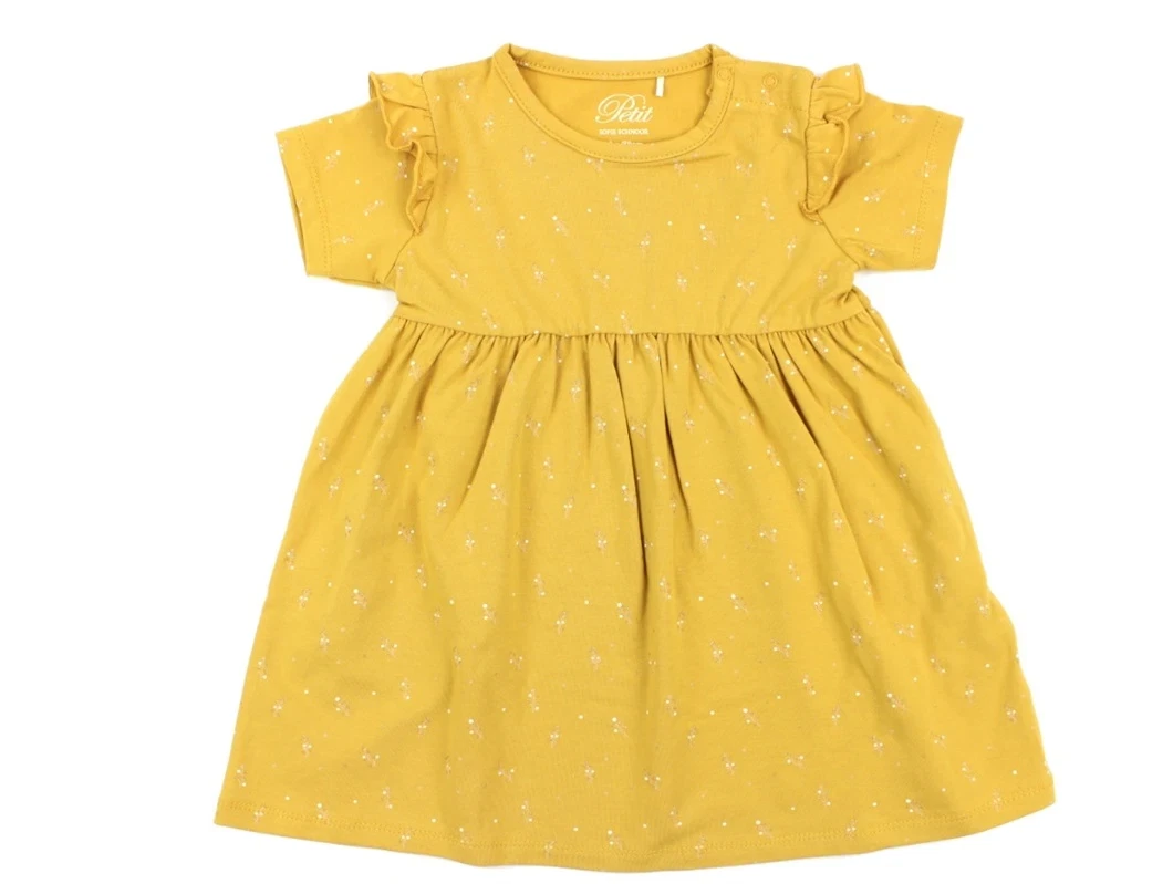Kjole i farven mustard med flæse på skulder og print fra Petit by Sofie Schnoor.