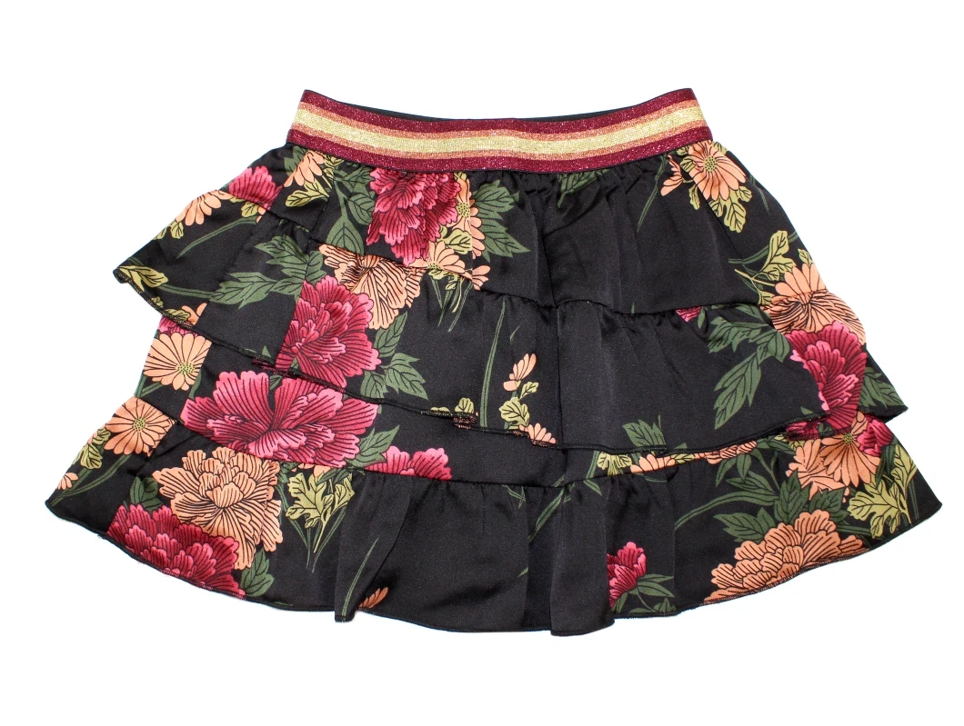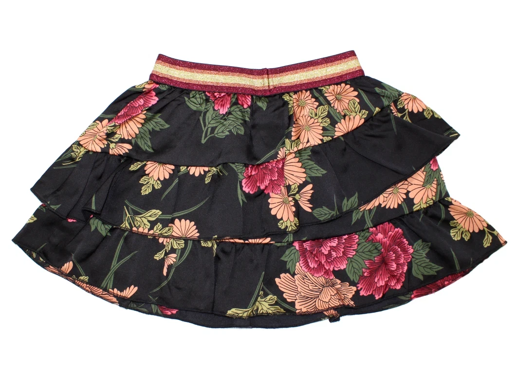 Sort nederdel med blomsterprint og flæser fra Petit by Sofie Schnoor. Glitter elastikbånd i taljen.