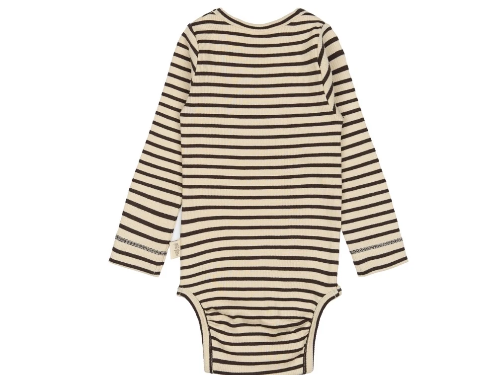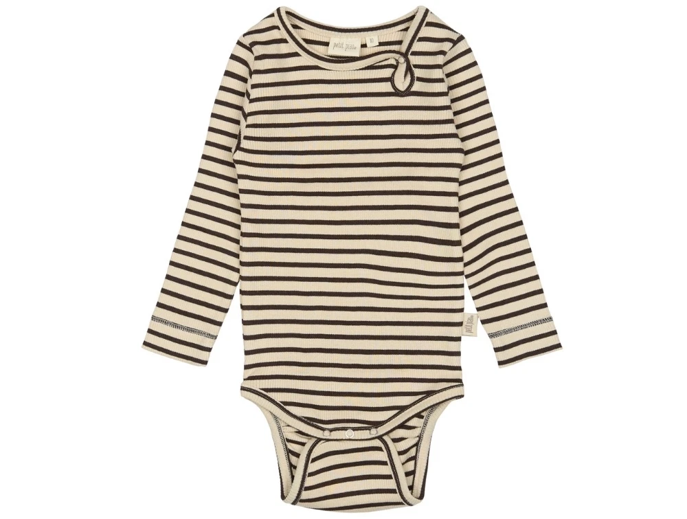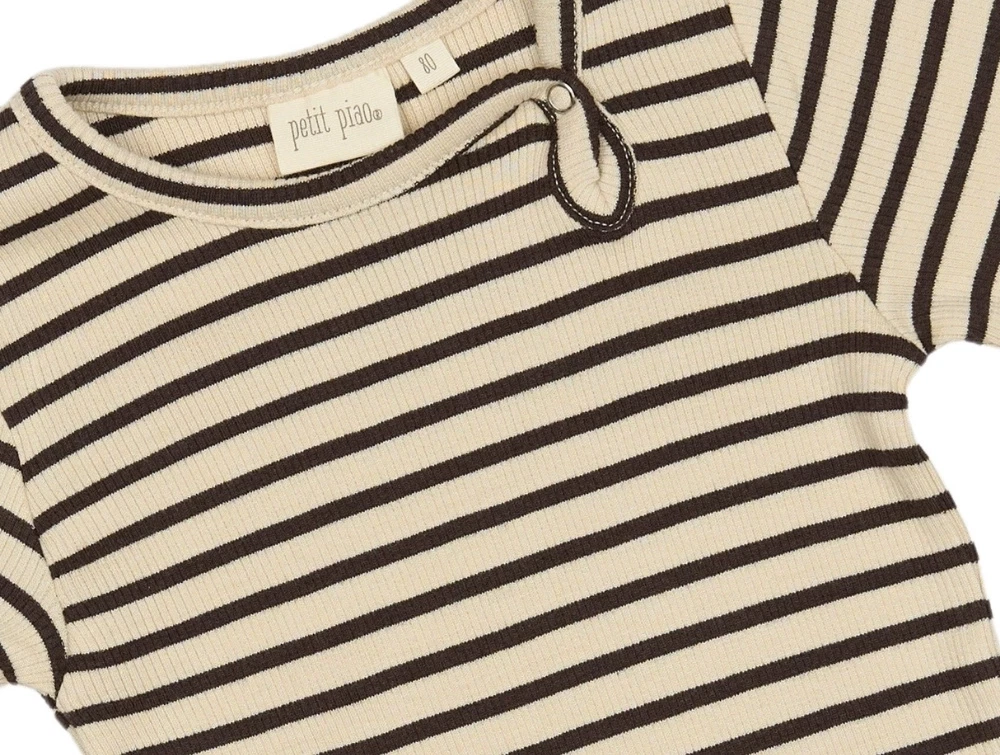 Langærmet body i brun- og råhvidstribet rib fra Petit Piao.