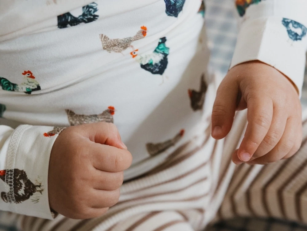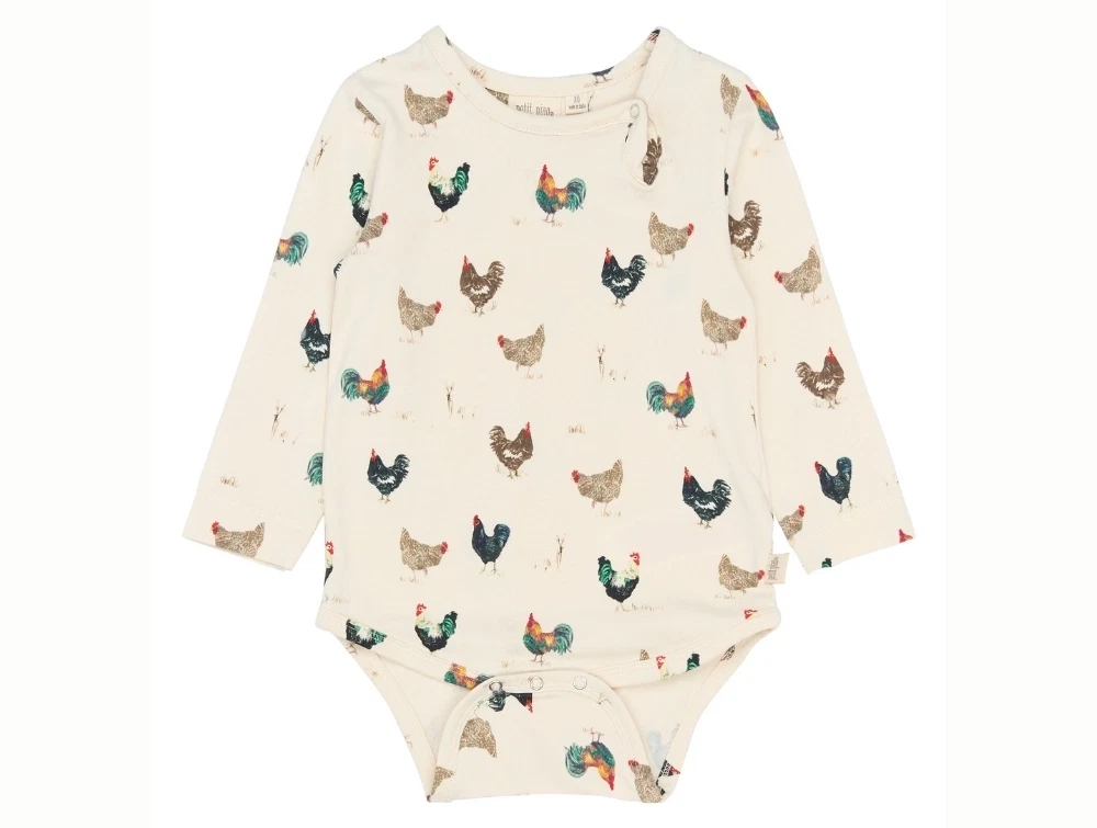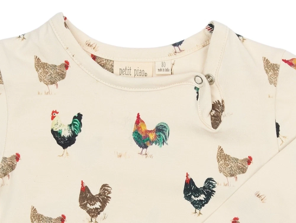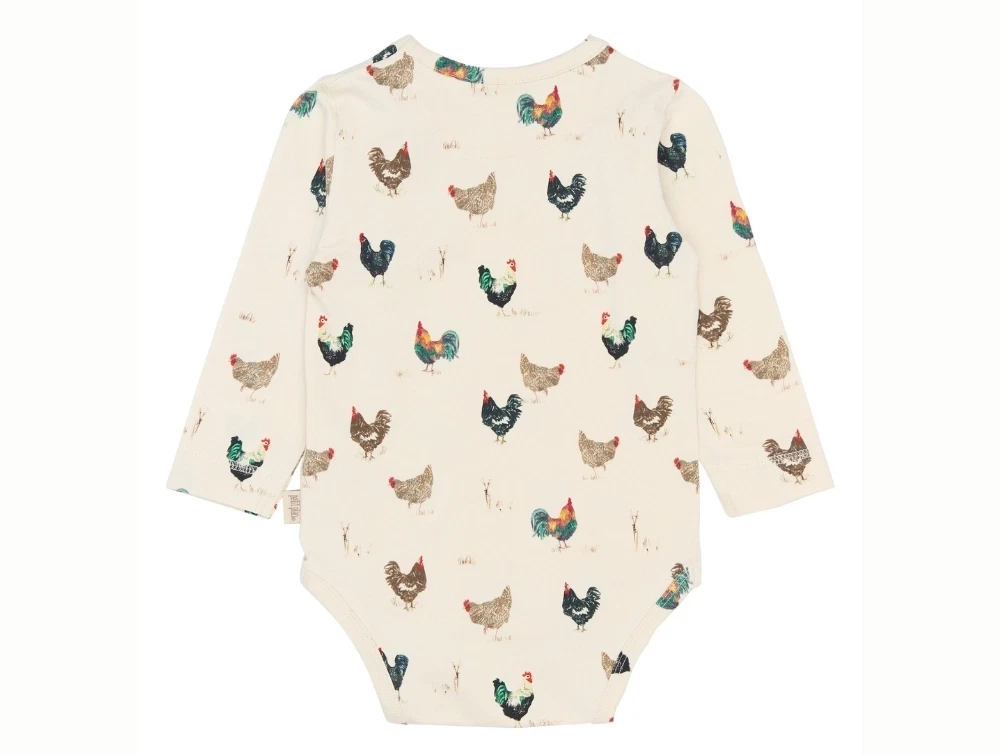 Bodystocking i råhvid nuance (Eggnog Rooster) fra Petit Piao med et fint akvarelprint af haner og høns.
