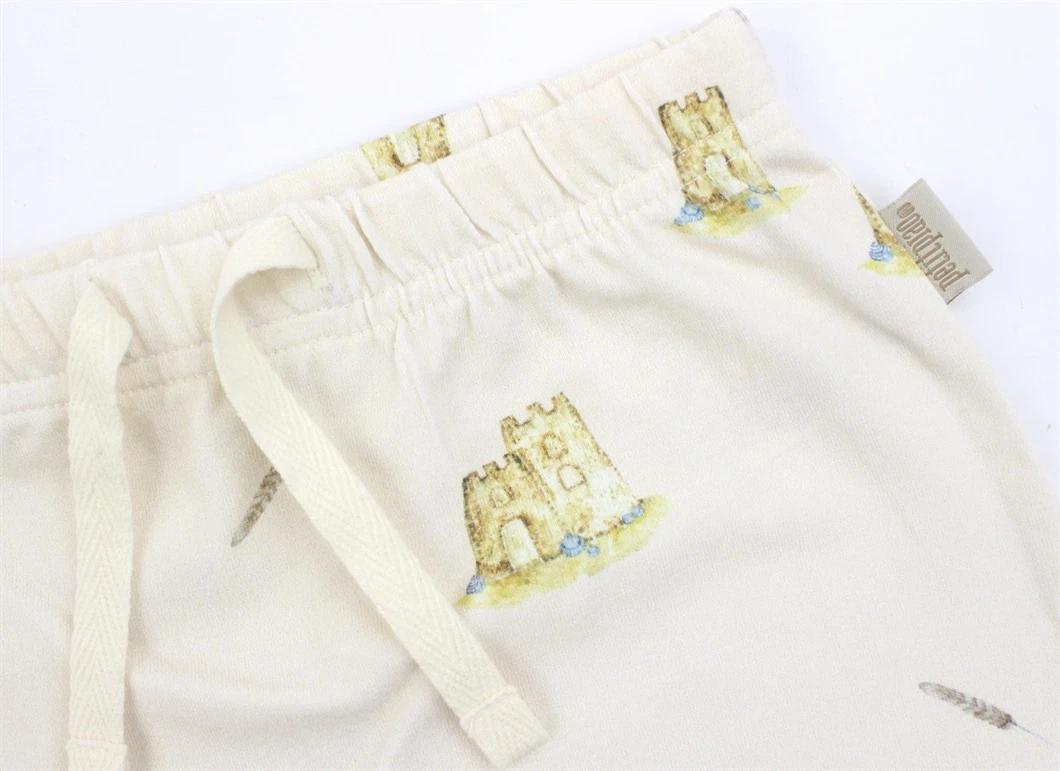 Shorts i økologisk bomuld med print af sandslotte fra Petit Piao.