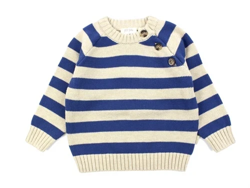 Stribet strikbluse i økologisk bomuld i farverne denim blue og soft sand fra Petit Piao.