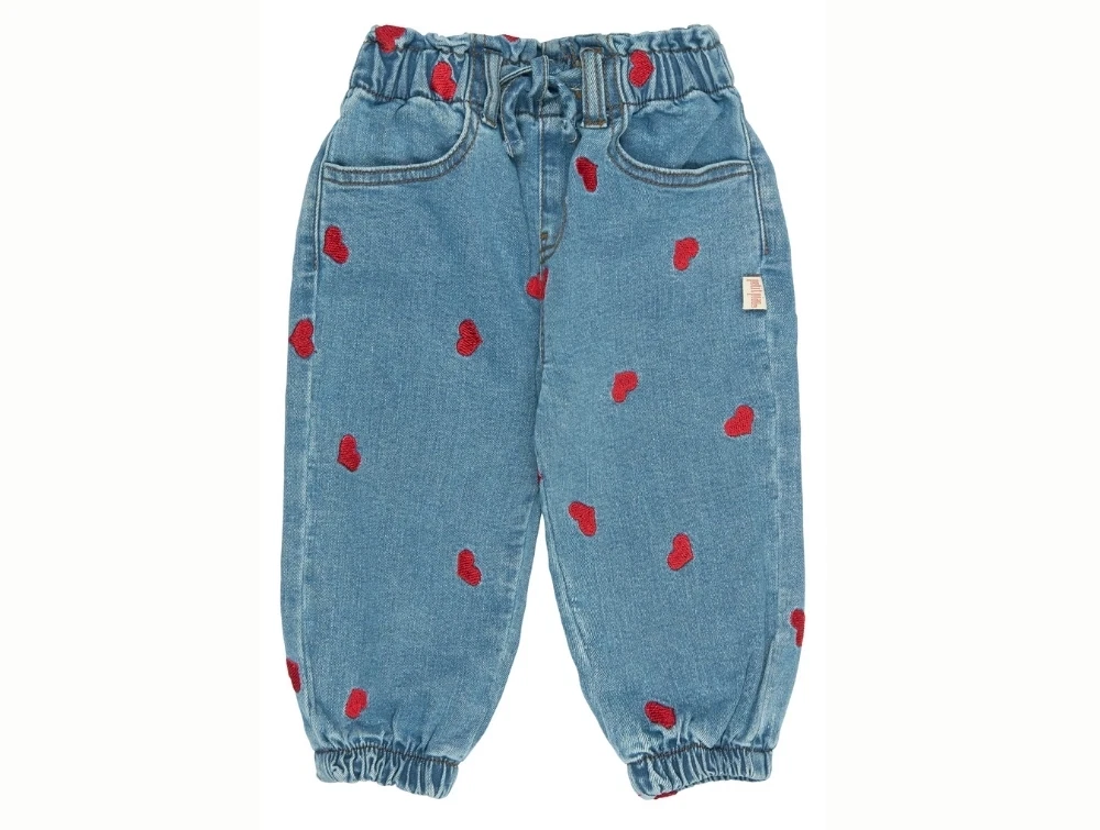 Denim bukser i lys blå vask (light blue denim emb) fra Petit Piao med fine, broderede røde hjerter fordelt over hele stoffet.