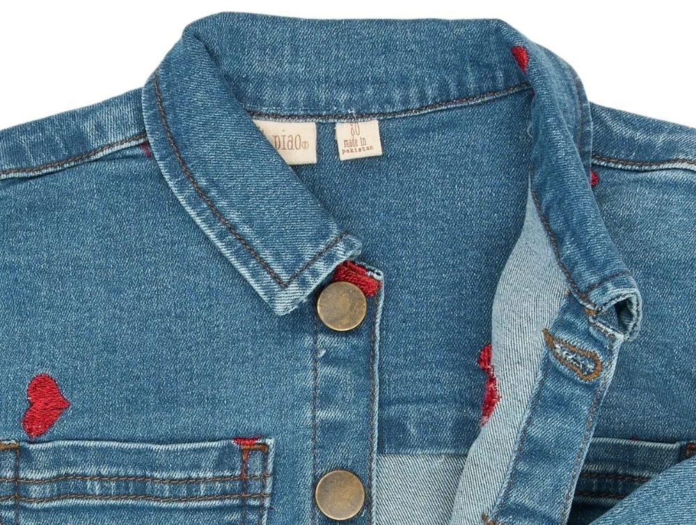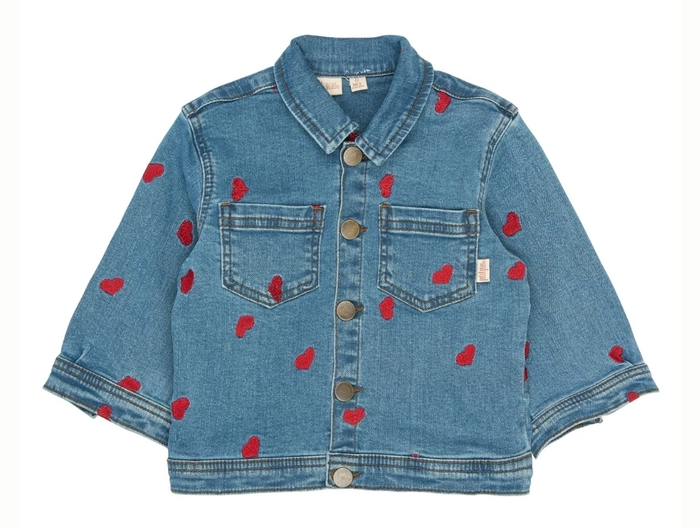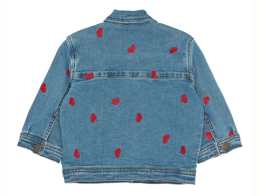 Denim jakke i lys blå vask (light blue denim emb) fra Petit Piao med de fineste broderede røde hjerter fordelt over hele jakken.