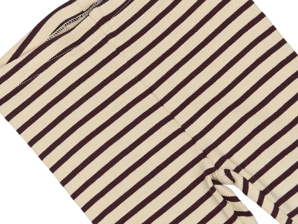 Leggings i mørkelilla og råhvide striber fra Petit Piao, fremstillet i blød og strækbar ribkvalitet.