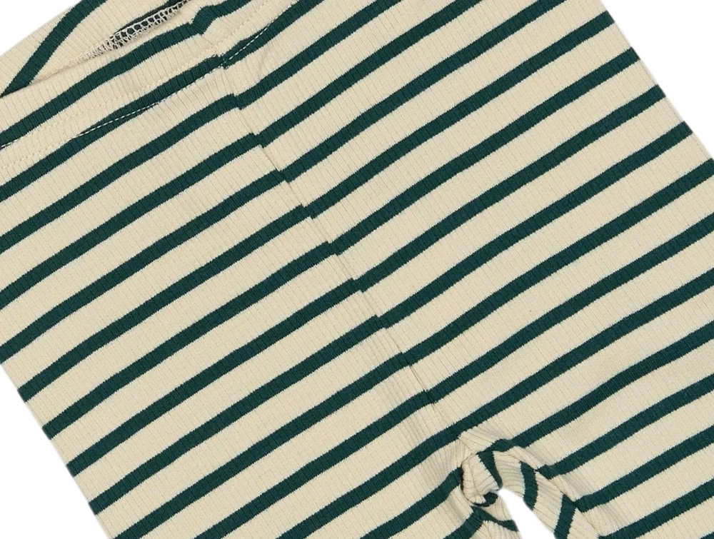 Leggings i mørkegrønne og råhvide striber fra Petit Piao, fremstillet i blød og strækbar ribkvalitet.