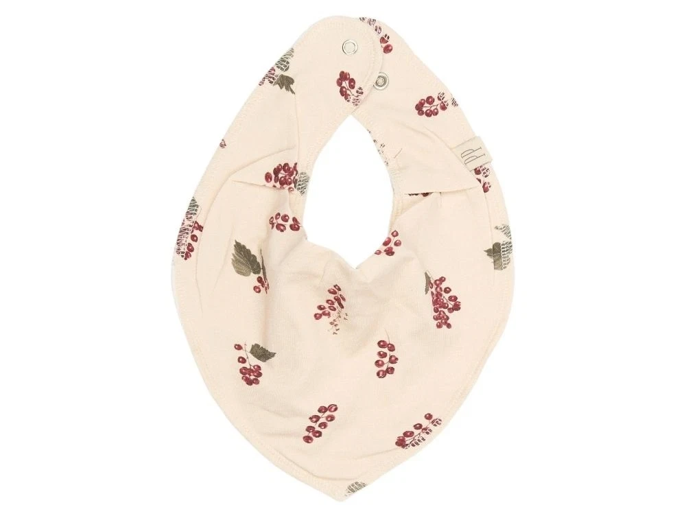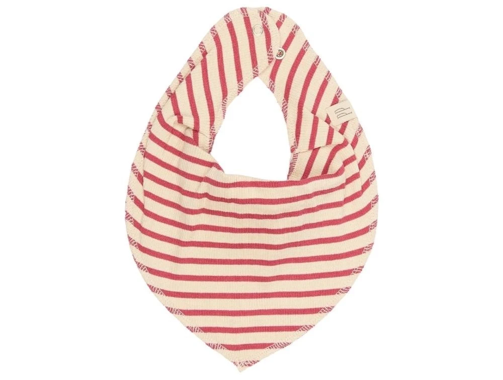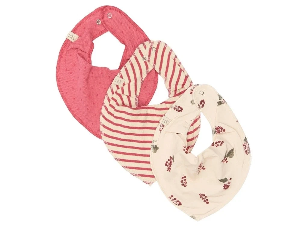 Tre fine savlesmække fra Petit Piao i bløde og behagelige materialer. Pakken indeholder én ensfarvet rød savlesmæk i ribkvalitet, én stribet i rød og råhvid i ribkvalitet og én råhvid med akvarelprint af ribsbær i en glat jersey. Savlesmækkene har to trykknapper i nakken, så de nemt kan justeres i størrelsen for optimal pasform.