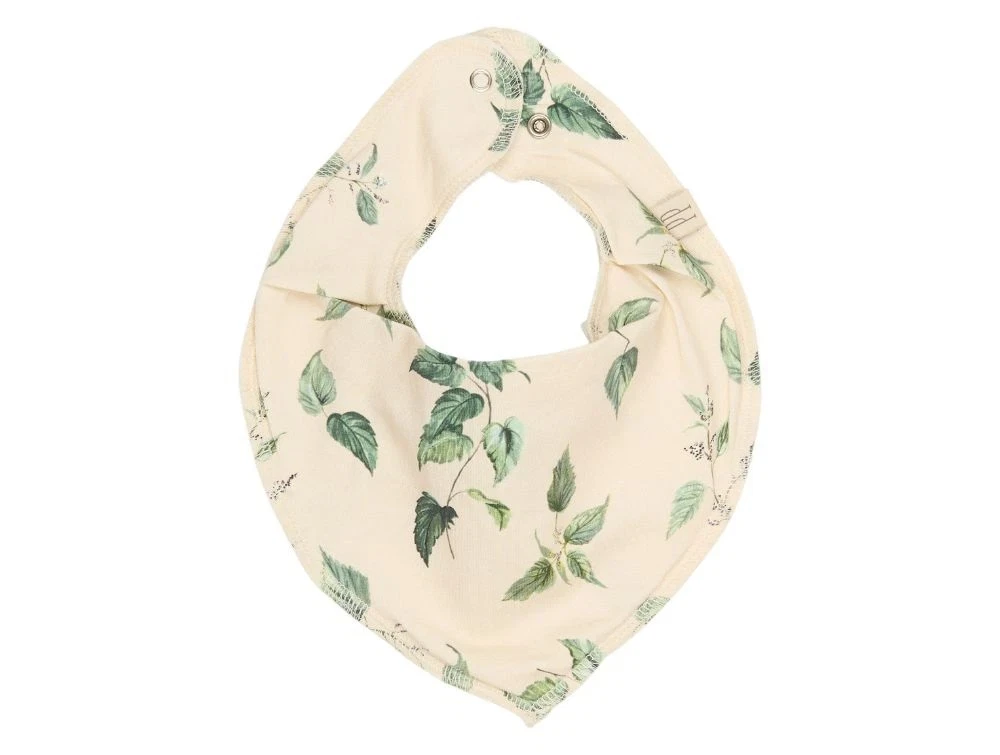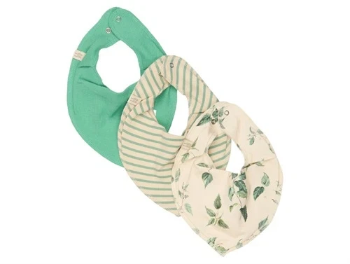 Tre fine savlesmække fra Petit Piao i bløde og behagelige materialer. Pakken indeholder én ensfarvet grøn savlesmæk i ribkvalitet, én stribet i grøn og råhvid i ribkvalitet og én råhvid med akvarelprint af brændnælder i en glat jersey.