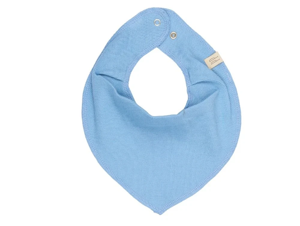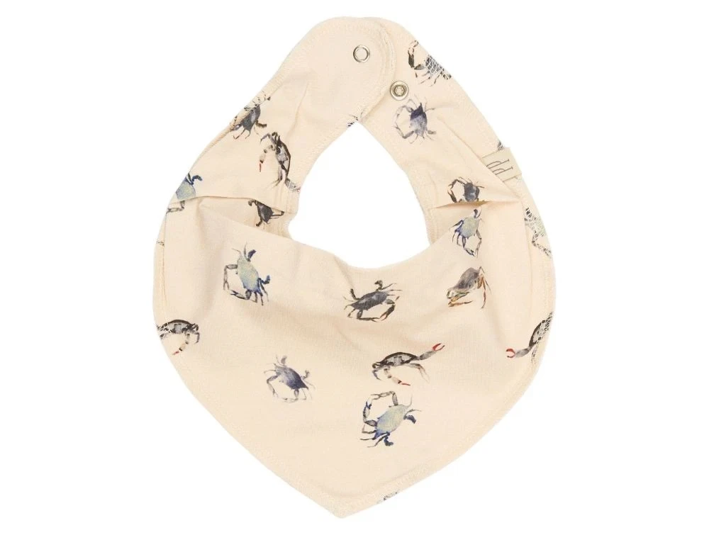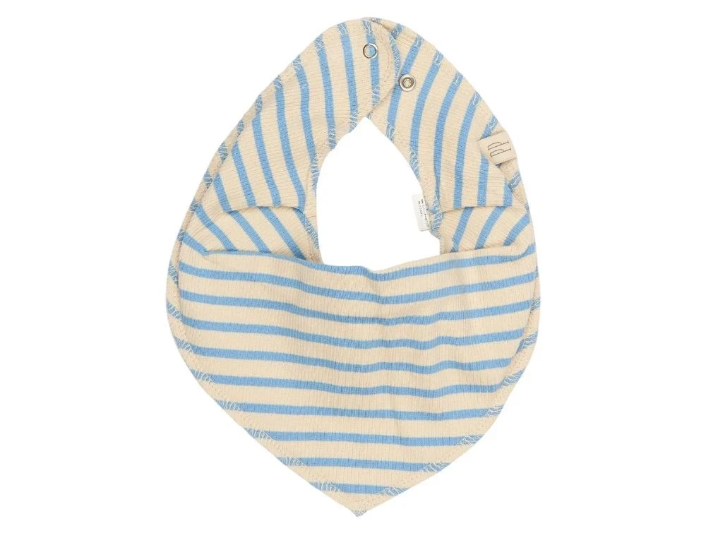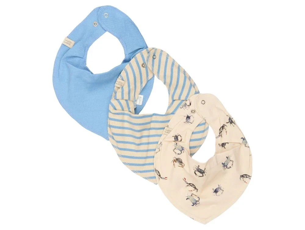 Tre fine savlesmække fra Petit Piao i bløde og behagelige materialer. Pakken indeholder én ensfarvet lys blå savlesmæk i ribkvalitet, én stribet i lys blå og råhvid i ribkvalitet og én råhvid med akvarelprint af små krabber i en glat jersey.