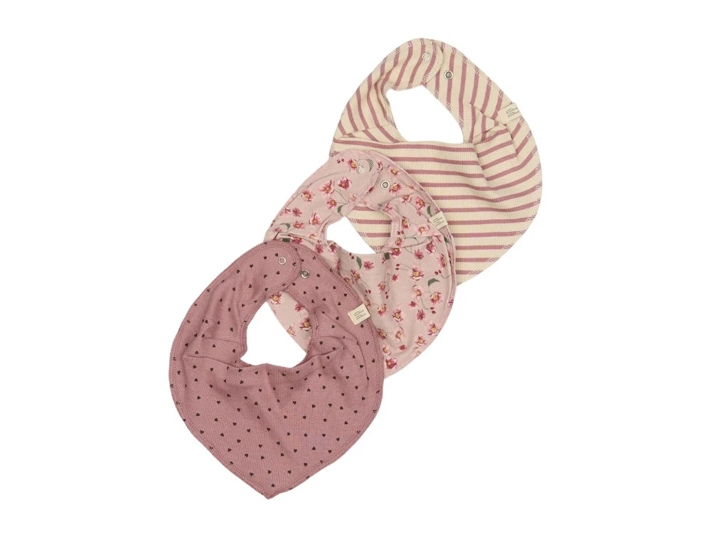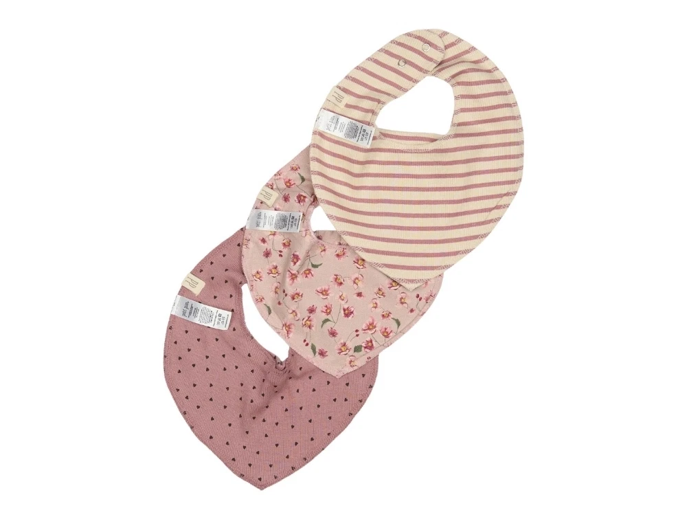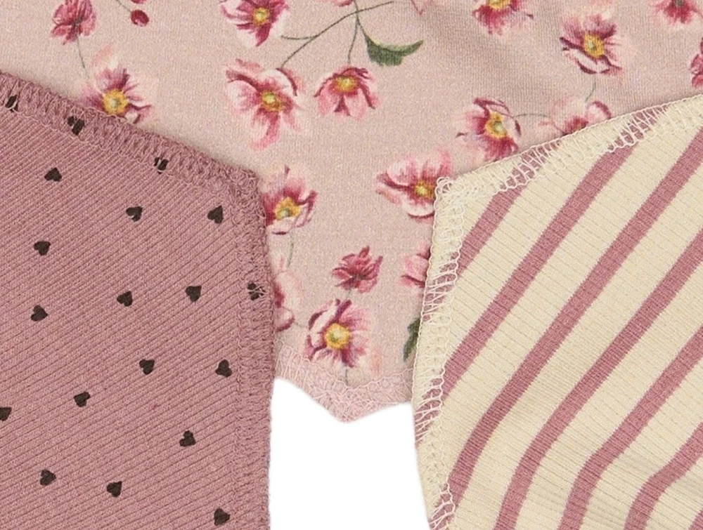 3-pak savlesmække i rosa og naturfarvede nuancer fra Petit Piao. Pakken indeholder én med blomsterprint, én med striber og én med små hjerter.