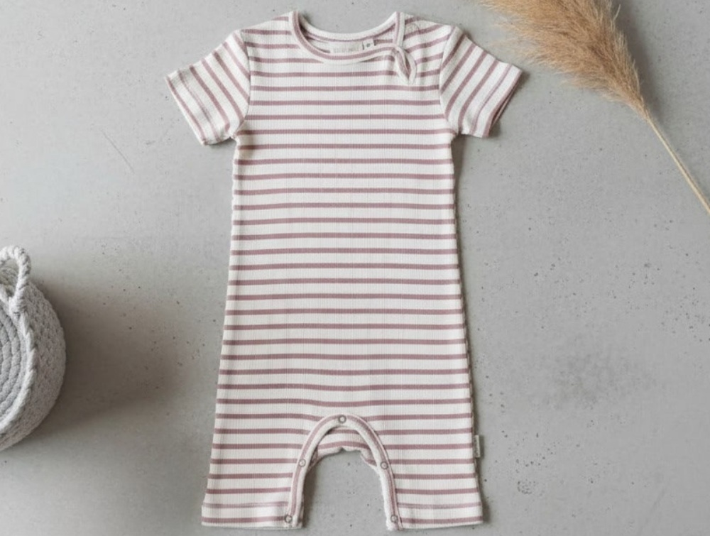 Stribet kortærmet jumpsuit i farven sea shell pink fra Petit Piao.