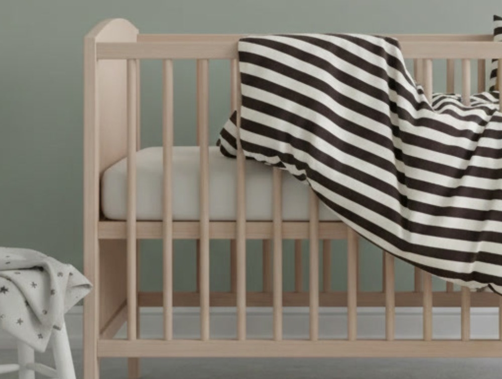 Sengetøj til baby med striber i farverne coffee og cream fra Petit Piao.