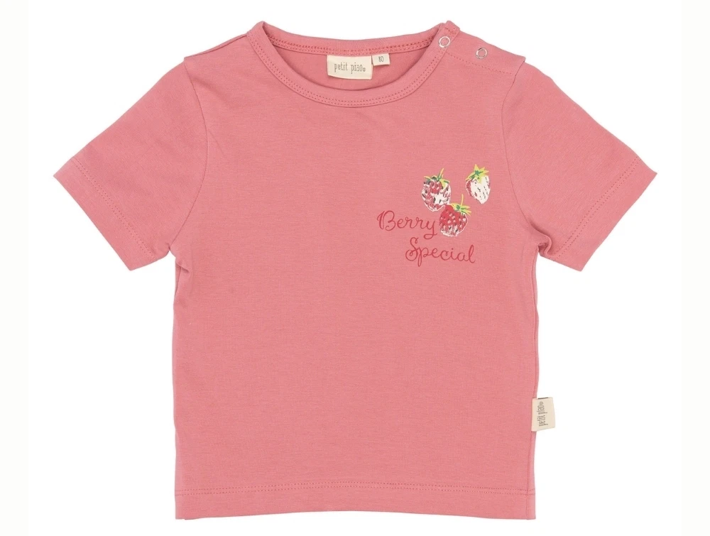 Kortærmet t-shirt i rosa nuance (Dusty Rose) fra Petit Piao med et fint lille “Berry Special”-print og tre små jordbær på brystet.