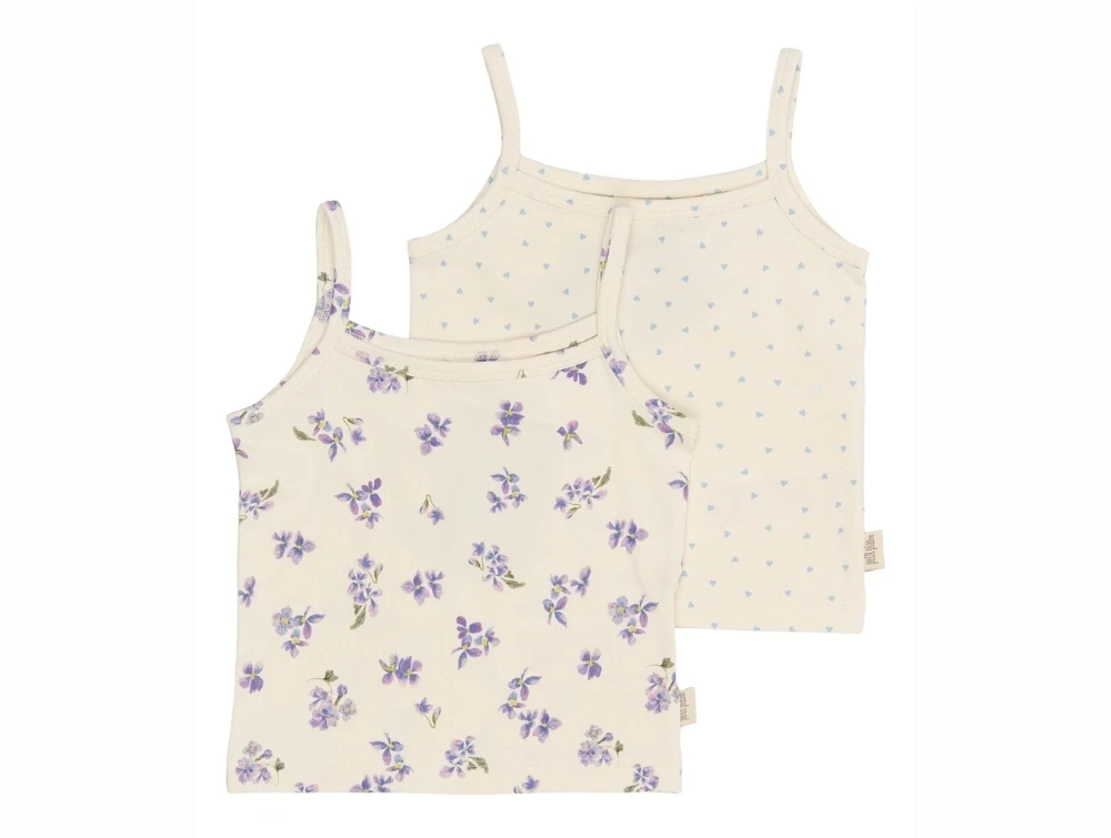 Sættet består af én råhvid undertrøje med et fint akvarelprint af lilla violer og én råhvid model med små blå hjerter.