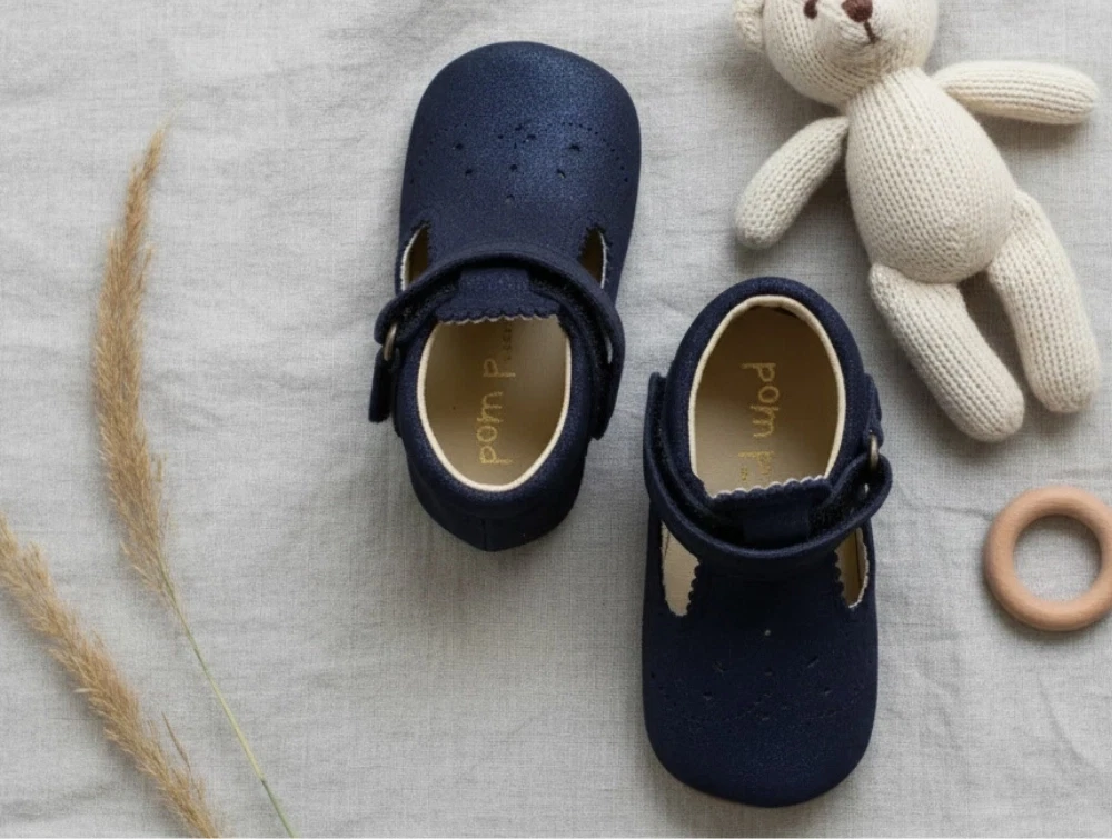 Ballerinahjemmesko i farven blue glitter i ruskind fra Pom Pom. Hjemmeskoene er bløde i skindet og har en superfleksibel og skridsikker gummisål. Lukkes nemt med velcrorem.