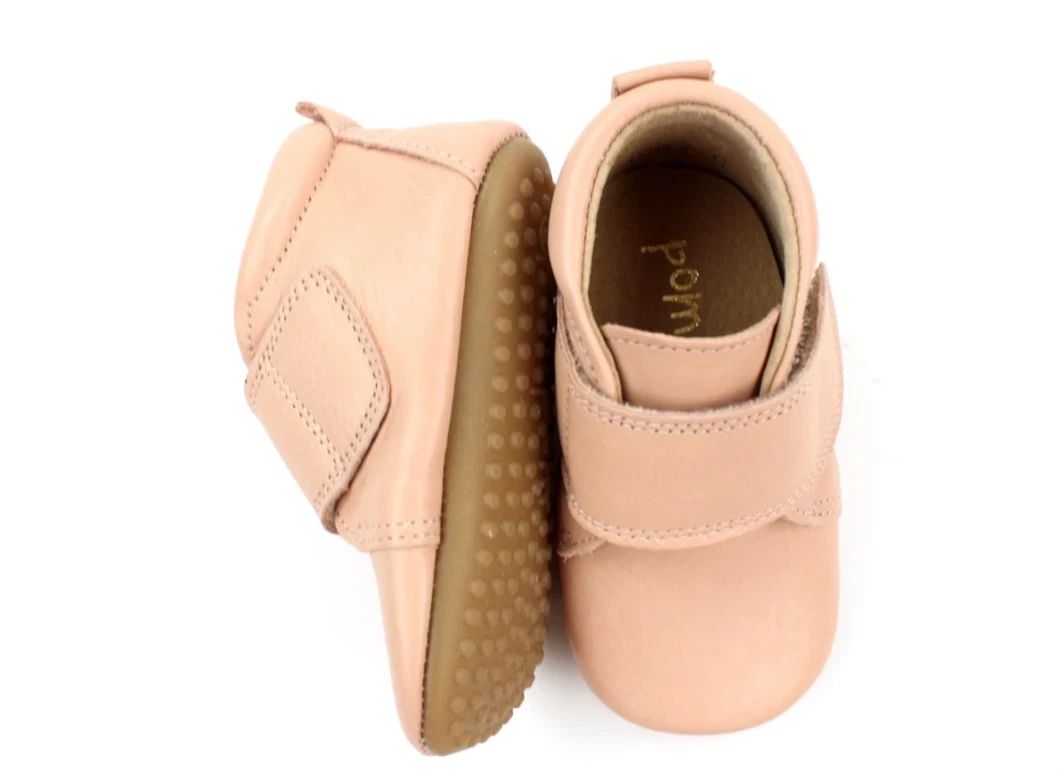 Rosa skindhjemmesko fra Pom Pom. Hjemmeskoene er bløde i skindet og har en superfleksibel og skridsikker gummisål. Lukkes nemt med velcrorem.