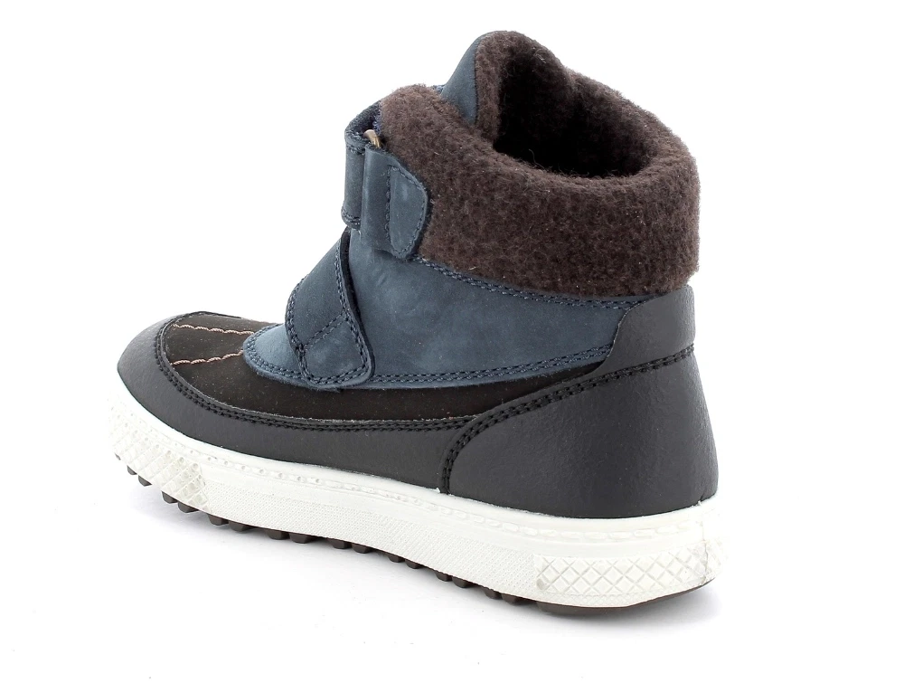 Vinterstøvle i blå og sort fra Primigi. Modellen er udstyret med to velcroremme, så den er nem at tage af og på. Den nederste del af overdelen er forstærket med gummi, hvilket giver ekstra beskyttelse i vådt og mudret vejr. Støvlen er let i vægten og har en ergonomisk form, der støtter foden på en naturlig måde.