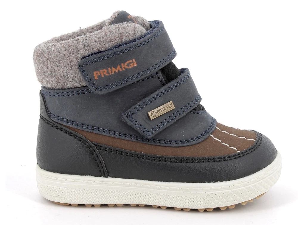 Primigi vinterstøvle blå, sort og brun til baby med velcroPrimigi ankelstøvle i nubuck med uldmix og GORE-TEXPrimigi børnestøvle blå/sort/brun med skridsikker sål