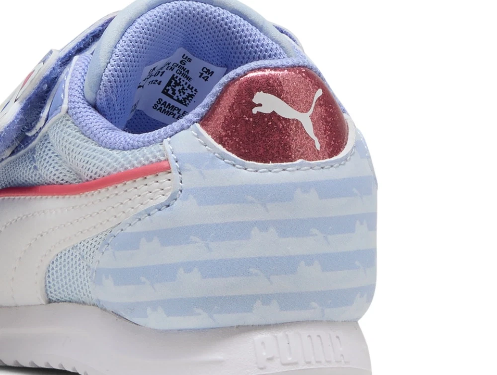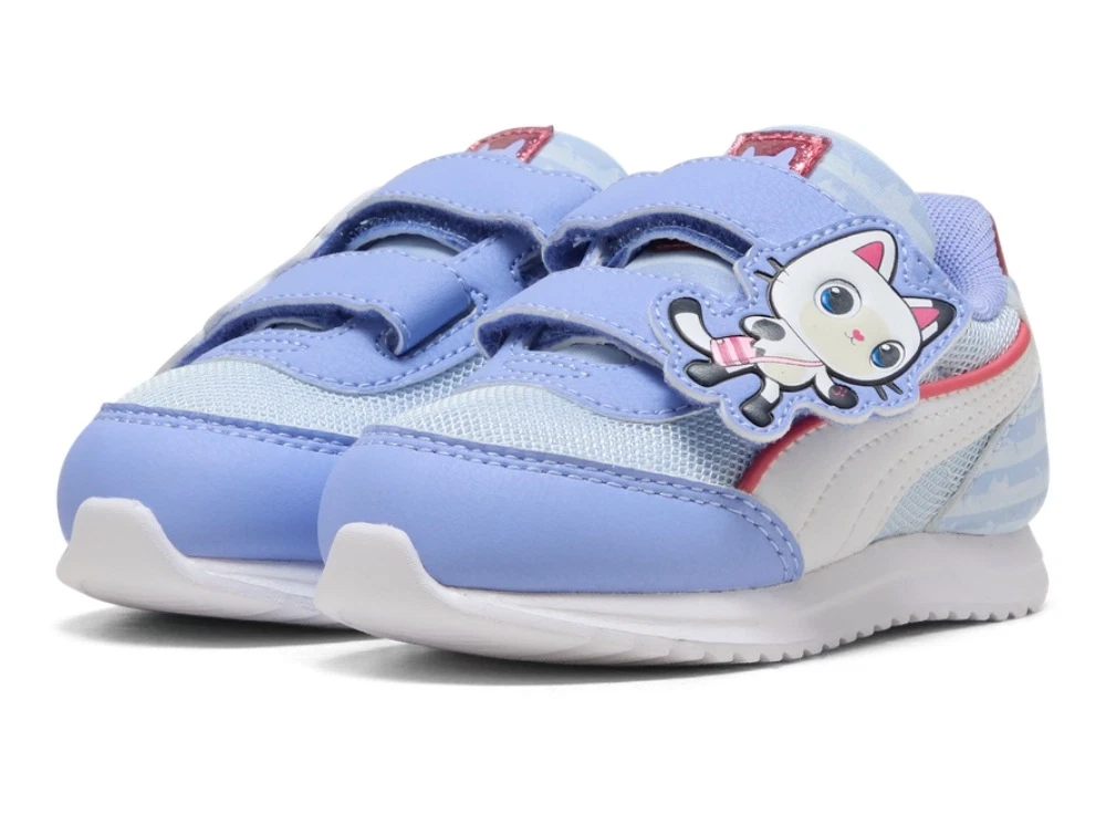 Sneaker i en lys lilla nuance fra Puma med motiv fra Gabby's Dollhouse. R78 Lightwind er lavet i tekstil og syntetisk materiale og har en let konstruktion, der gør modellen velegnet til børn. Skoen har velcrostrop og en fleksibel sål.