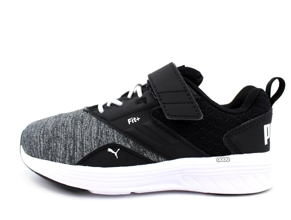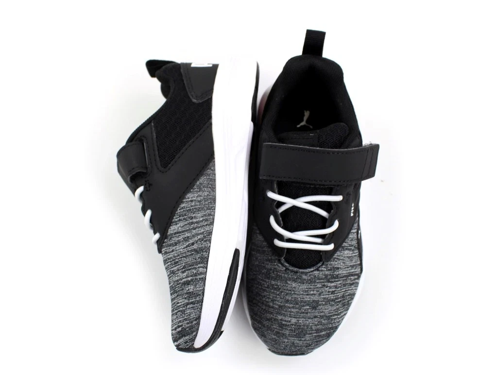 Meget lette sneakers i sort, grå og hvid fra Puma med elastik- og velcrolukning.