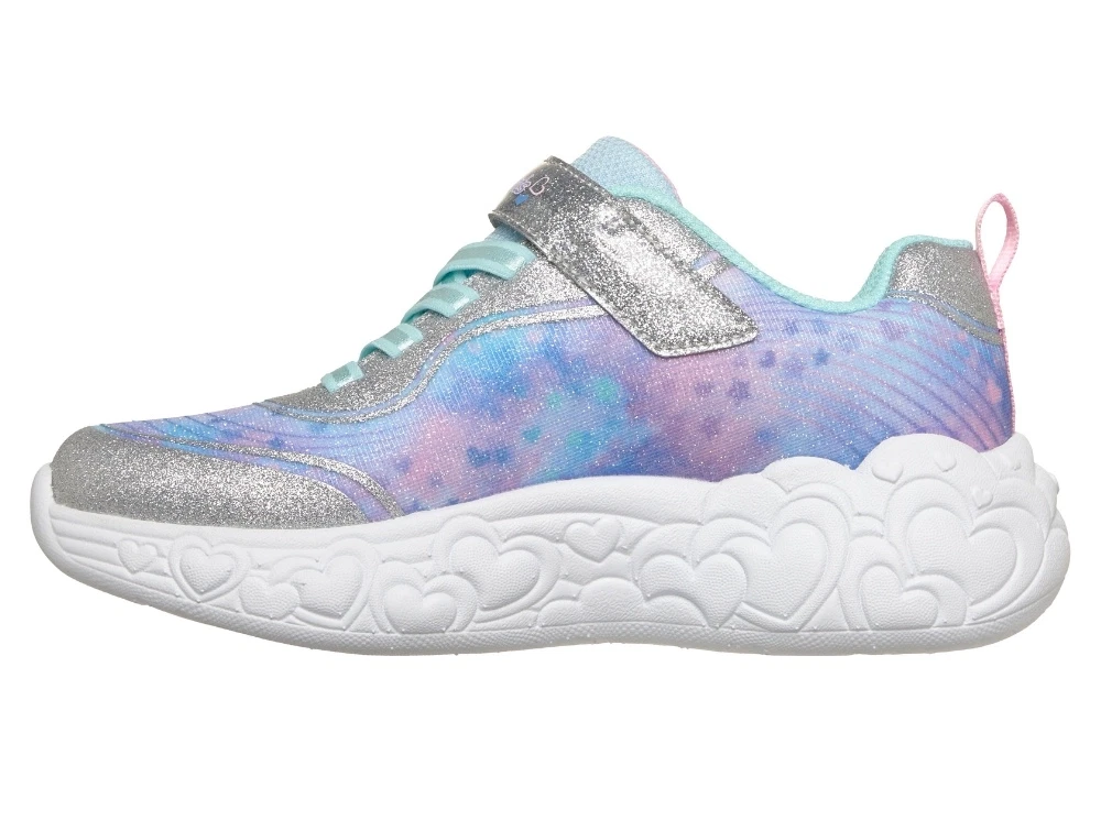 Sneaker i sølv nuance fra Skechers. Modellen Eternal Heart Lights er designet med glitrende detaljer og et farverigt mønster i rosa og lilla nuancer. I mellemsålen ses små hjerteformer, som lyser op ved bevægelse og giver skoen et legende udtryk.