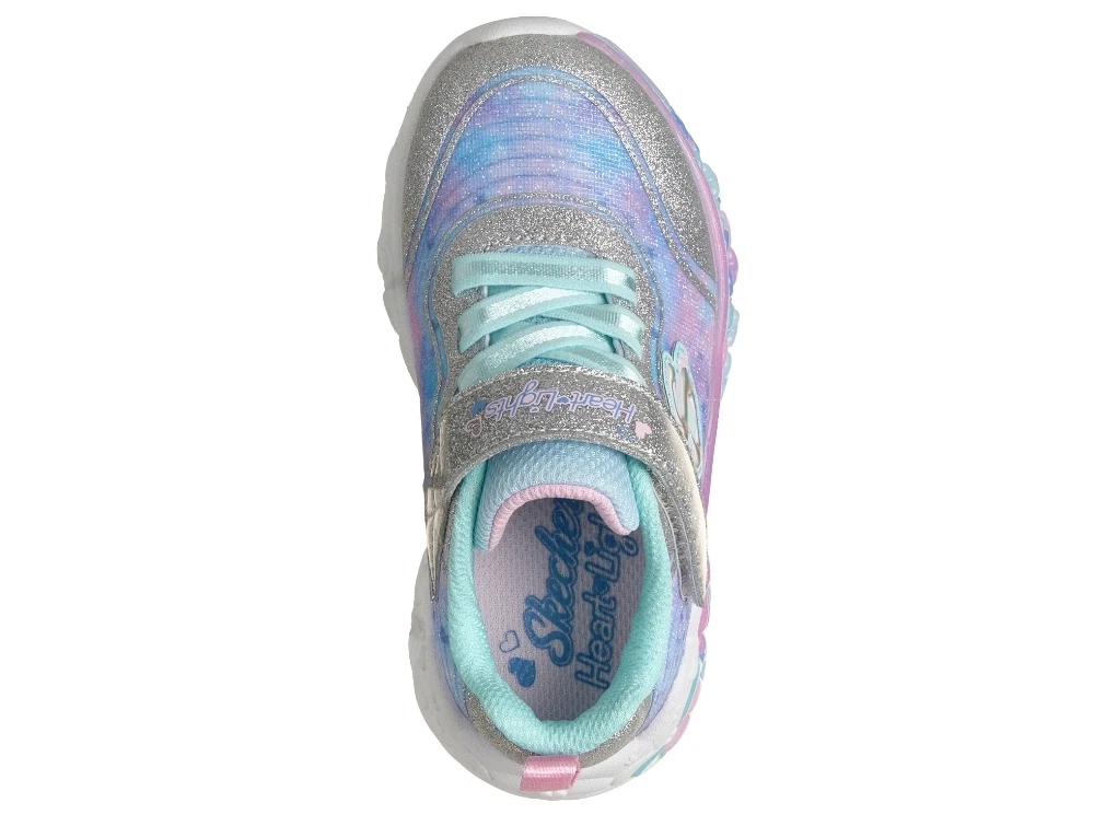 Sneaker i sølv nuance fra Skechers. Modellen Eternal Heart Lights har glimmer-detaljer og et farverigt mønster i blå og lilla nuancer. I mellemsålen ses små hjerteformer, som lyser op ved bevægelse og giver skoen et iøjnefaldende udtryk under leg.
