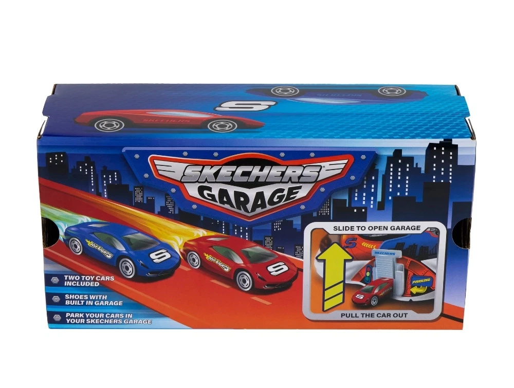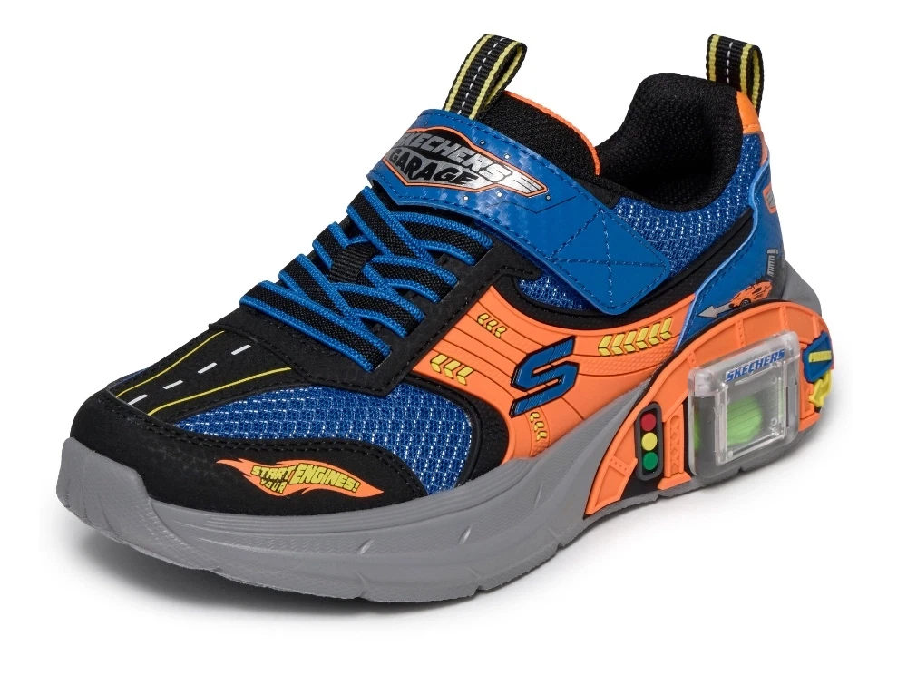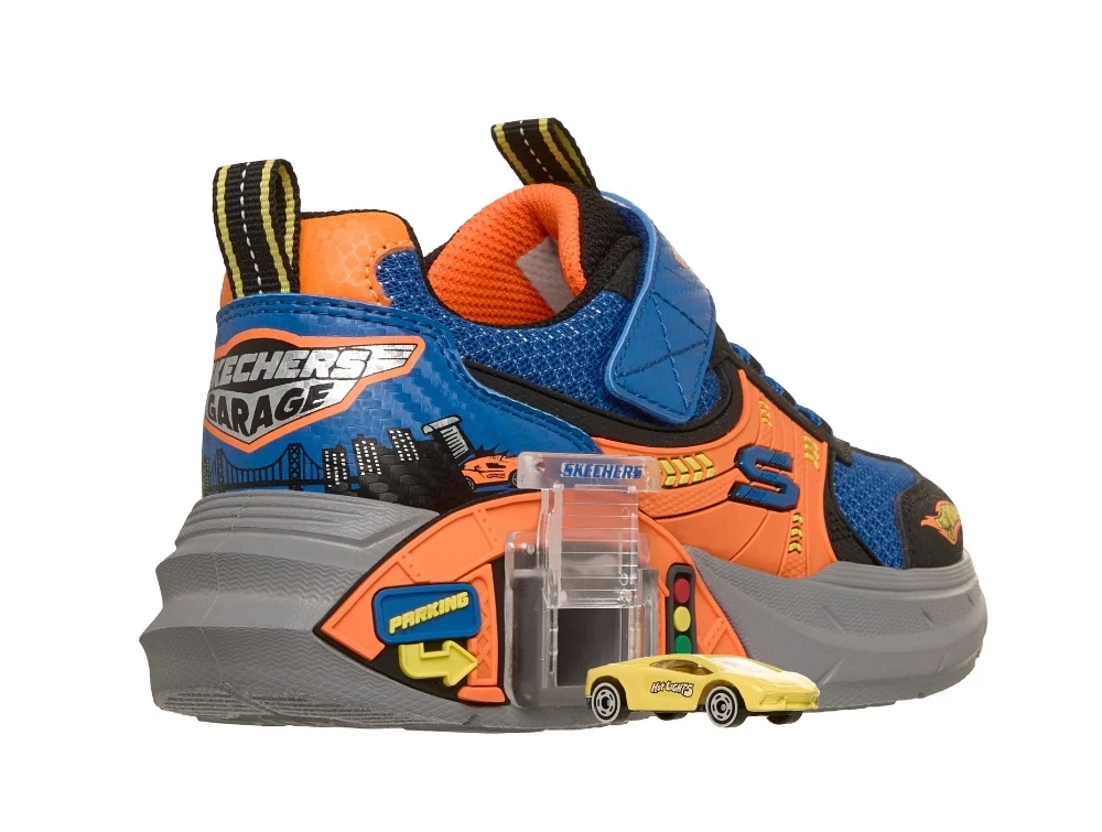 Multifarvet med sorte, blå og orange detaljer fra Skechers. Garage er en legende model med indbygget garage i mellemsålen og biltema-grafik på overdelen. Skoen leveres med to små legetøjsbiler, som kan opbevares i den transparente garage i sålen. Almindelig pasform og let konstruktion gør modellen velegnet til aktive børn.