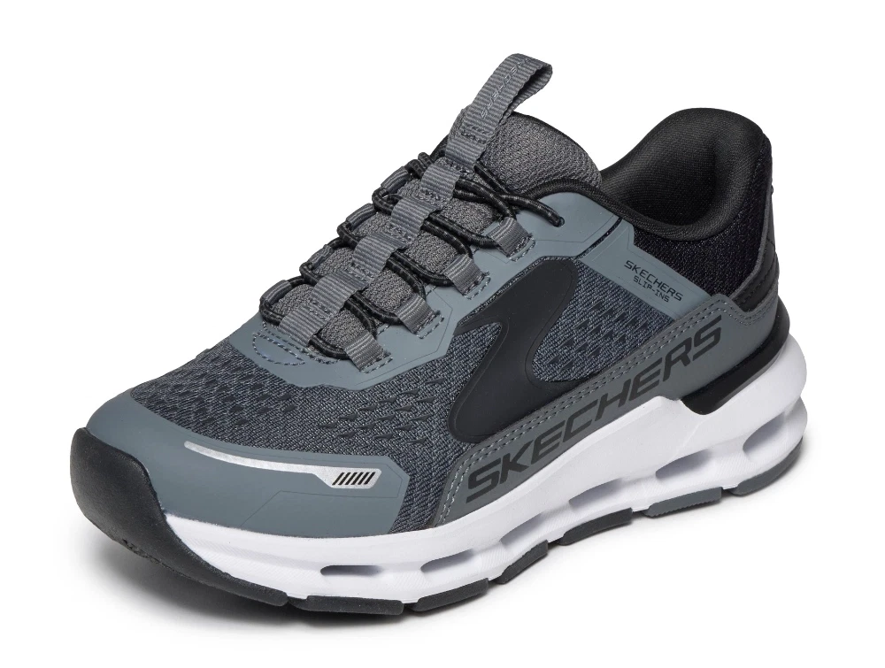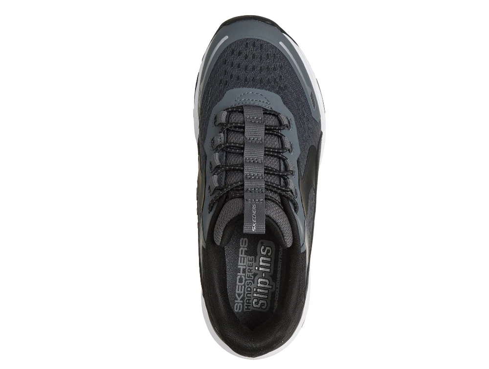 Sneaker i grå nuance fra Skechers med slip-ins funktion og sporty design. Modellen kombinerer mesh og syntetiske paneler med elastiske snørebånd og en stabil og stærk hælkonstruktion, der gør den nem at tage på uden brug af hænder.