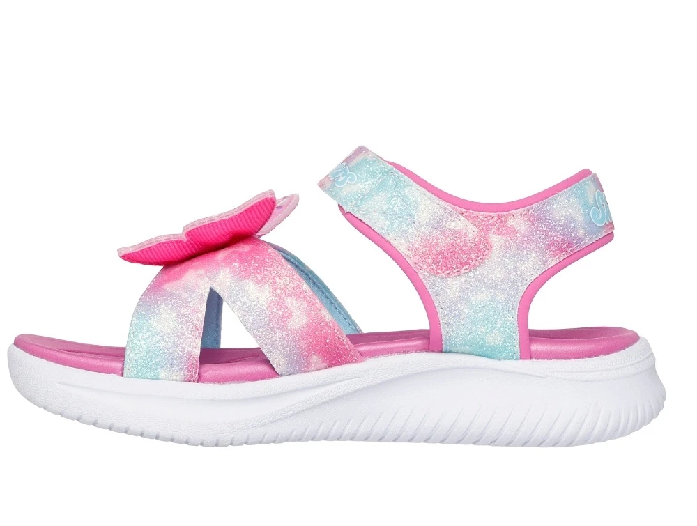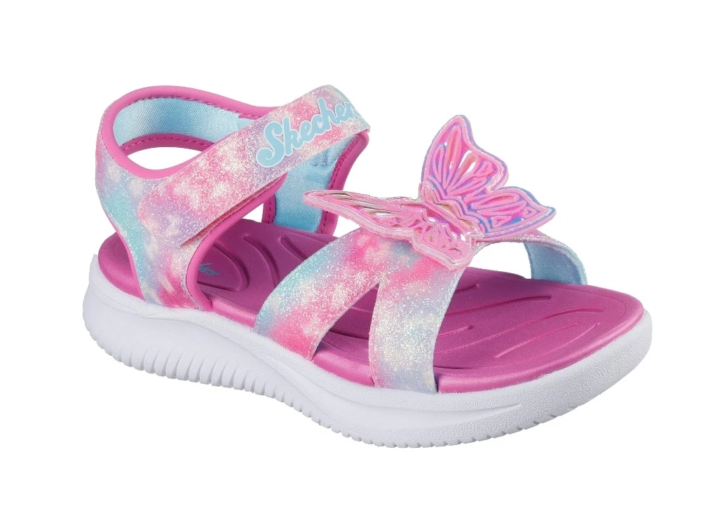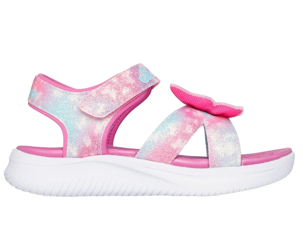 Sandal i pink nuancer med glimmer og farvespil fra Skechers med justerbare velcrostropper og lys i sålen. Modellen har en dekorativ sommerfugl på fronten, som lyser ved bevægelse og giver et farverigt udtryk.