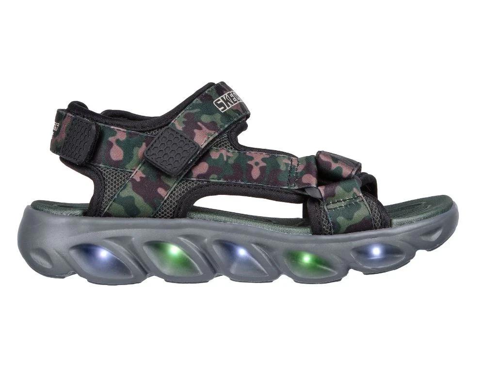 skechers sandal i sort og oliven med camouflageprint og velcrolukning, set fra sidenskechers sandal med velcrolukning og camouflageprint, set oppefraskechers sandal med mørk sål og mønstret bund, set nedefraskechers sandal med camouflage og blinklys i sålen, set fra siden med lys aktiveret