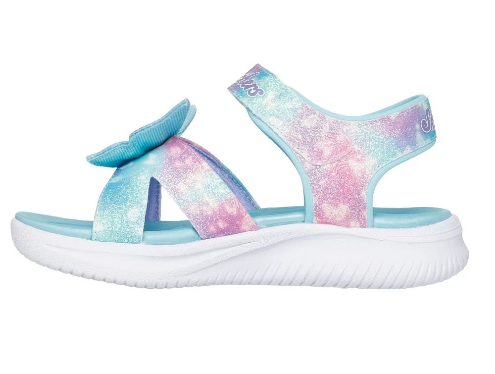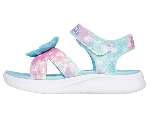 Let sandal fra Skechers i turkis og pink med glimmereffekt og en sommerfugl på forfoden.