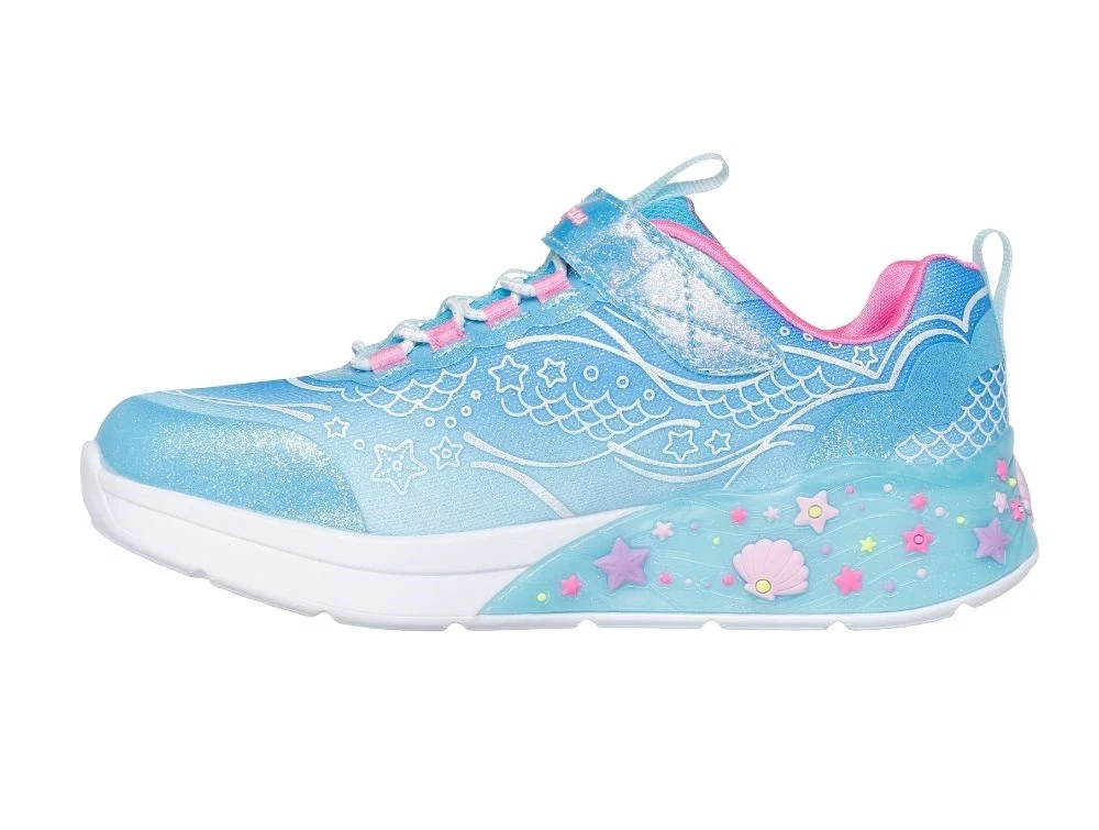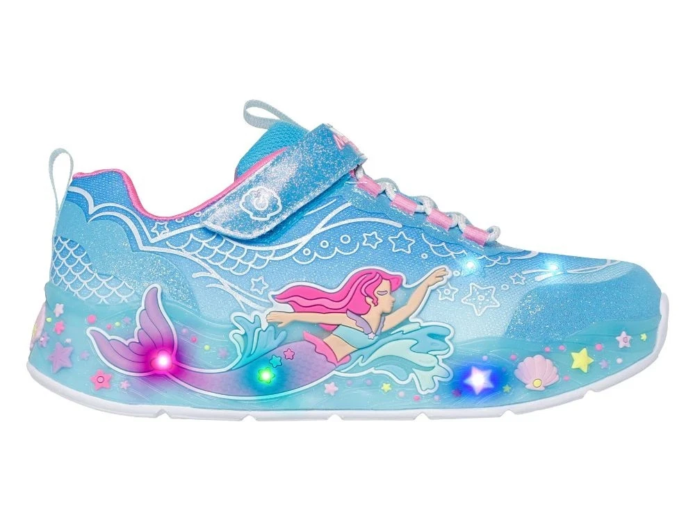Blå sneakers med glimmer og havfrue applikation fra Skechers med blinklys i sålen, som aktiveres ved bevægelse.