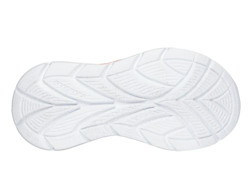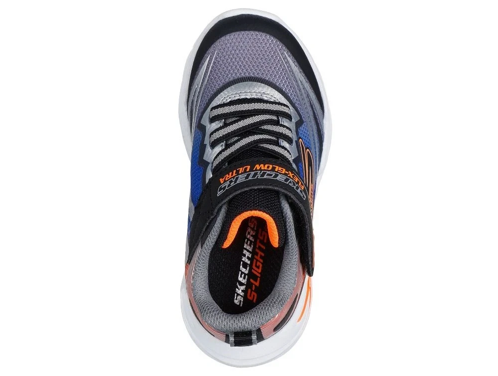 Sneakers i sort og sølv fra Skechers med blinklys i sålen. Blinklyset tændes, når skoene bevæges, og modellen har elastik over vristen samt justerbar velcrolukning for nem af- og påtagning. Skoene giver god støtte i hælkappen.