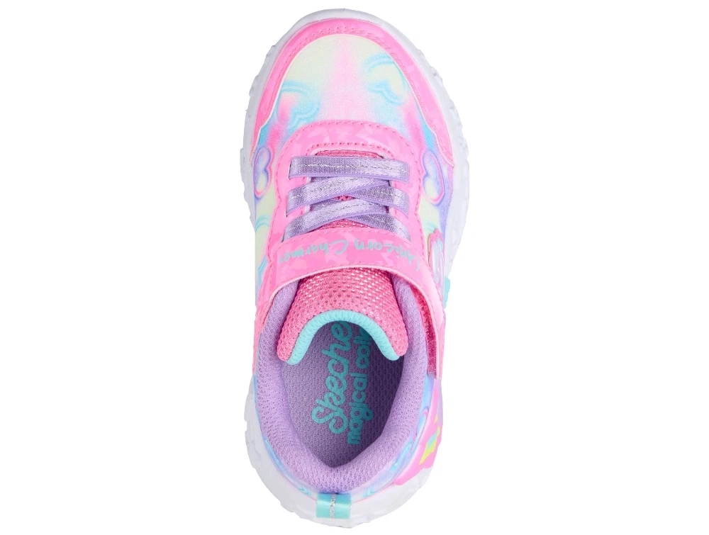 Skechers Unicorn Charmer - Lil Heart Sparkles sneakers i pink med glitrende mesh-overdel og regnbuehjerteprint. Mellemsålen er skulptureret som en enhjørning med integrerede blinklys, der aktiveres ved bevægelse. Modellen har elastiksnørebånd, velcrolukning og en polstret komfortindersål.