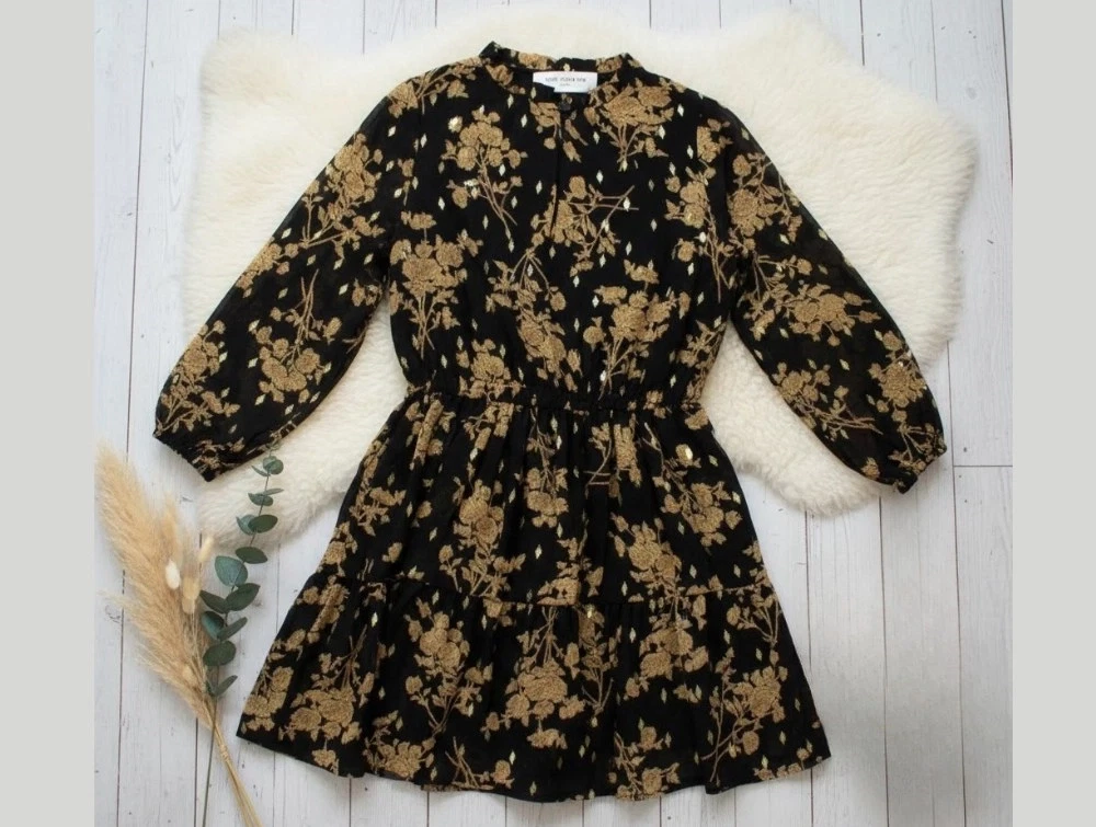 Sort kjole med blomsterprint og guld-detaljer fra Sofie Schnoor Girls. Kjolen har elastik ved ærmeslut.