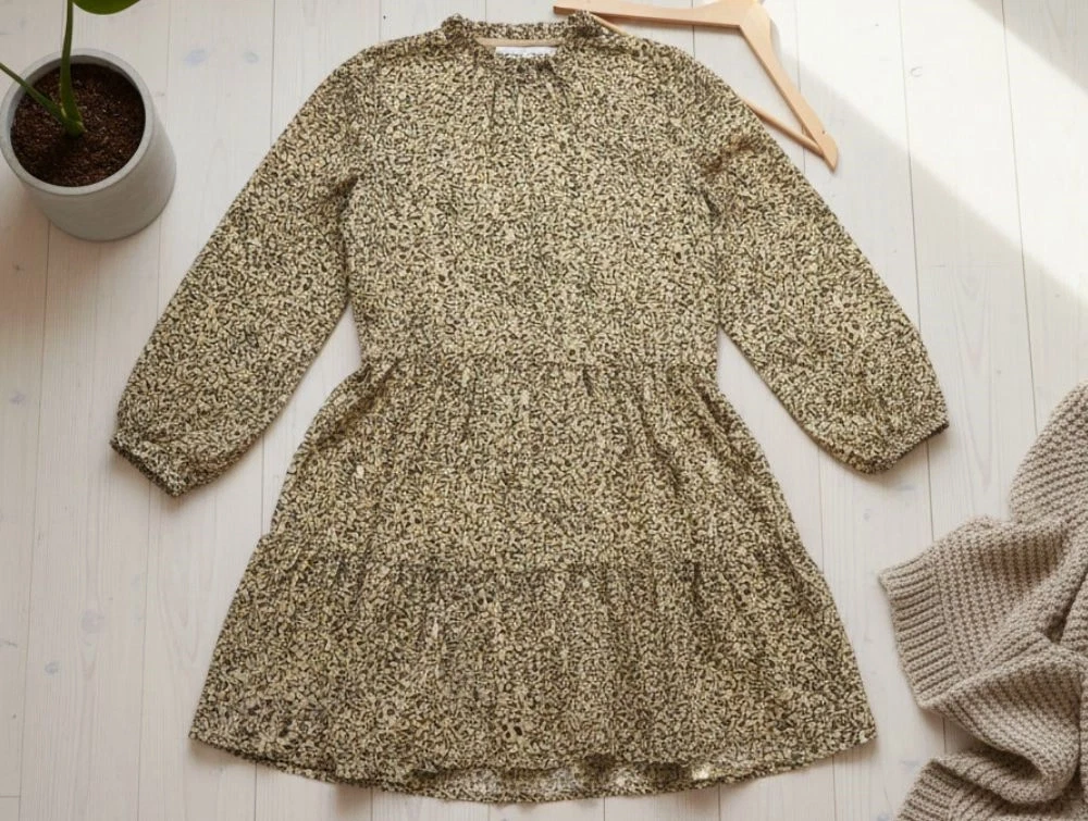 Kjolen har et underskørt og en knap ved halsen på forsiden. Der er elastik i taljen og ved ærmeslut.