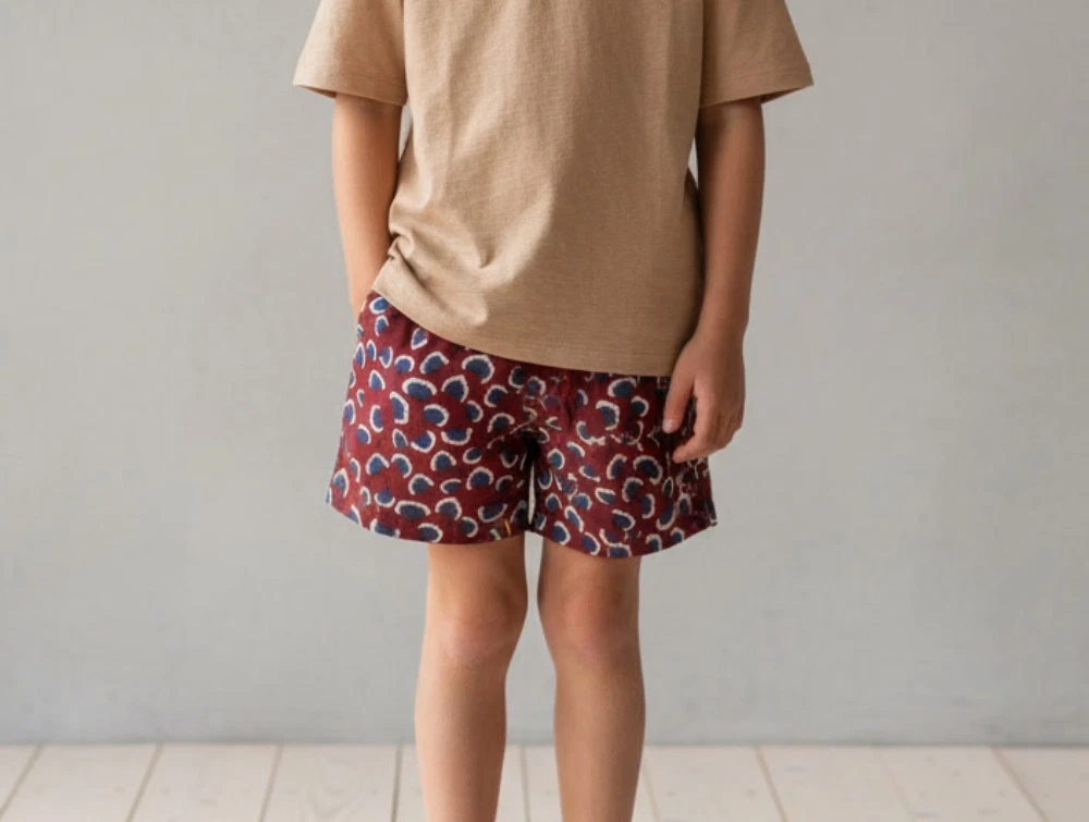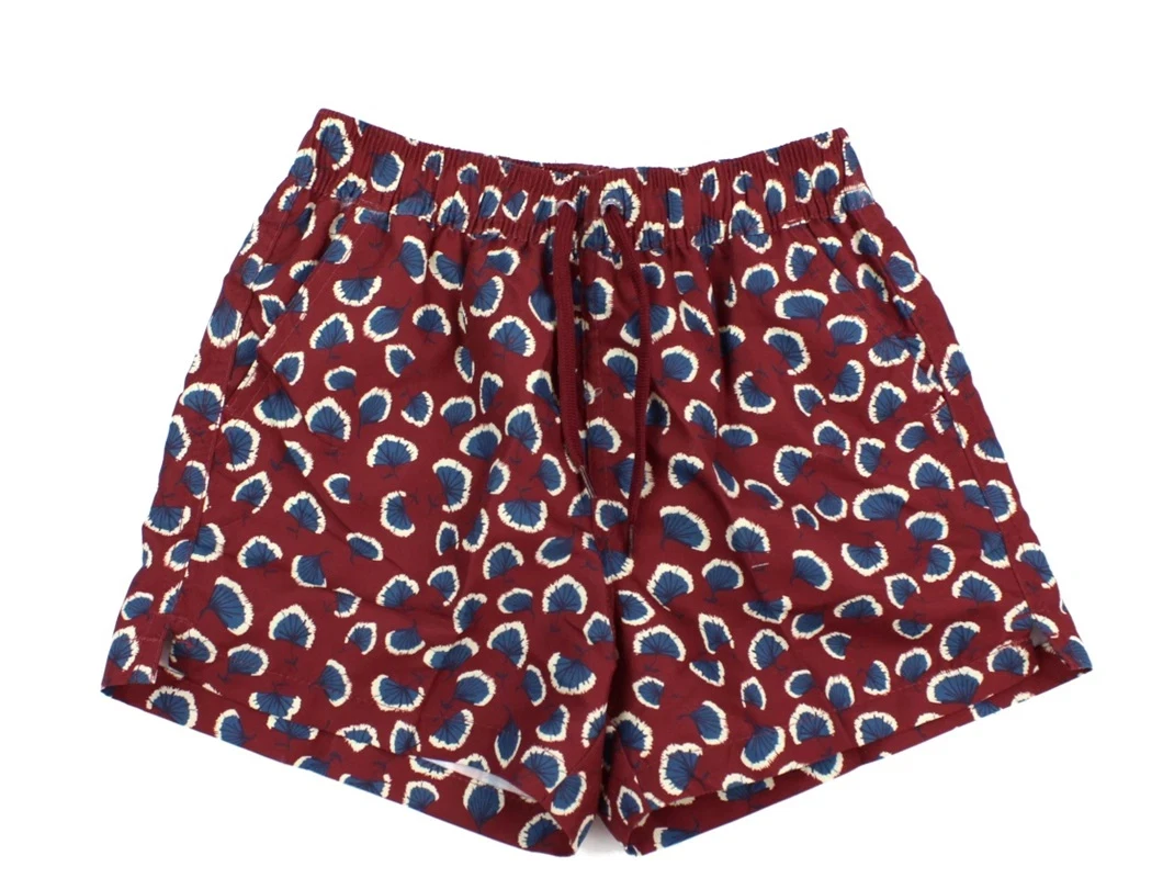 Badeshorts i farven russet brown med print fra Soft Gallery. Badebukserne har tre lommer og elastik i taljen.