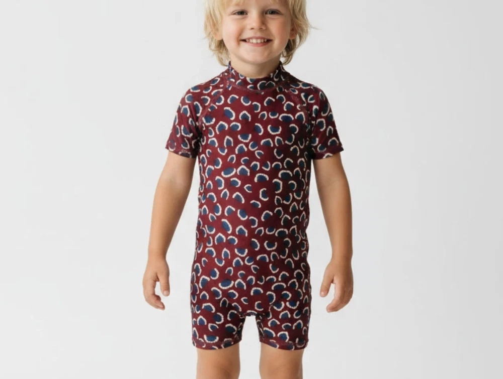 Badedragt i farven russet brown med print og med lynlås på ryggen fra Soft Gallery.