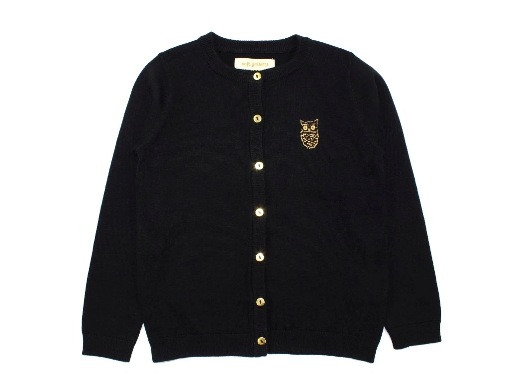 Sort strik cardigan med guldfarvet broderet ugle fra Soft Gallery.