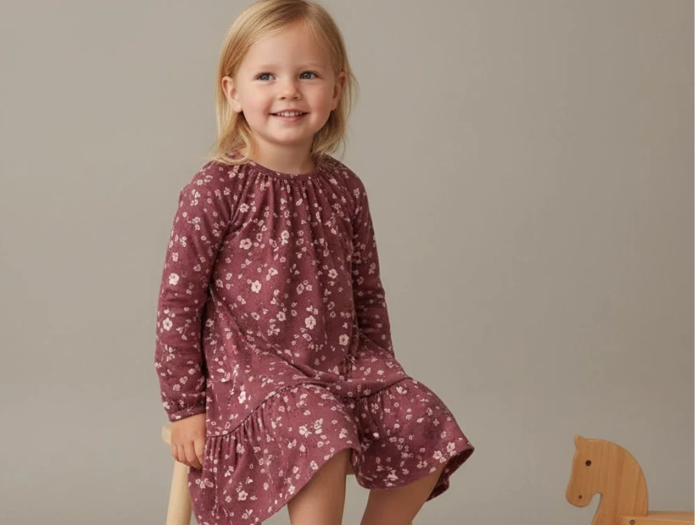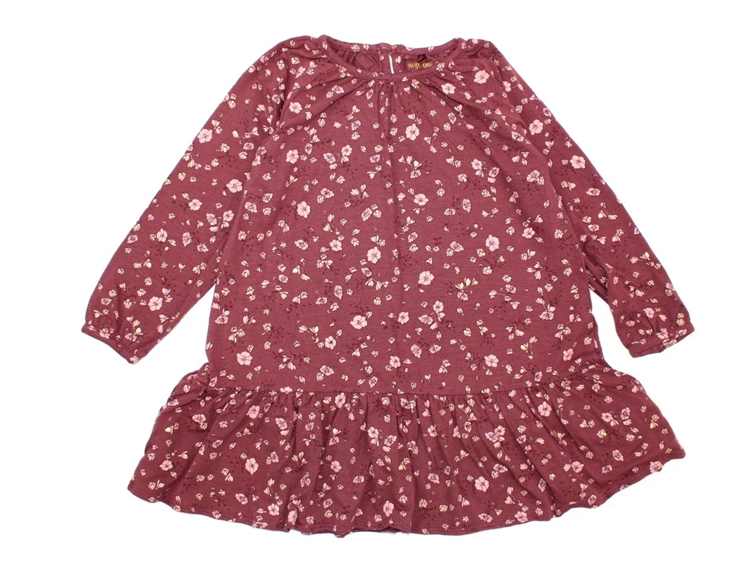 Kjole i farven oxblood med blomsterprint fra Soft Gallery.