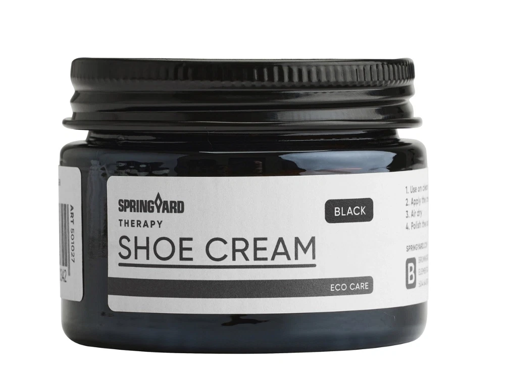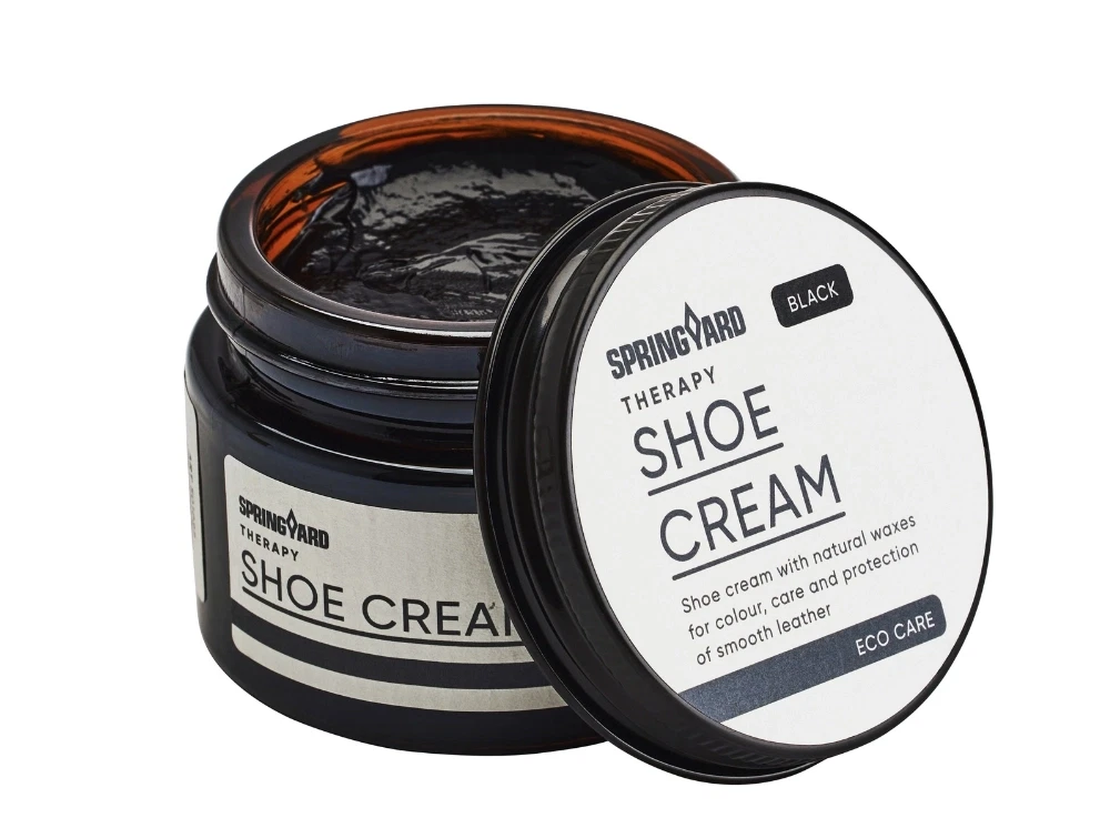 Springyard Shoe Cream er en plejende skocreme med naturlige vokse, som frisker op og beskytter sort glat læder. Skocremen er nem at påføre, giver en ensartet og flot sort farve og efterlader skoene velplejede og skinnende. Ideel til genopfriskning af farve og overflade.