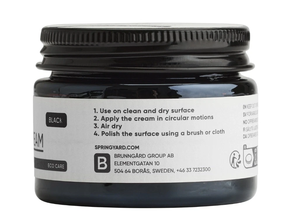 Springyard Shoe Cream sort skocreme i krukkeSpringyard Shoe Cream sort skocreme i krukke med låg åbentSpringyard Shoe Cream sort skocreme i krukke instruktioner label