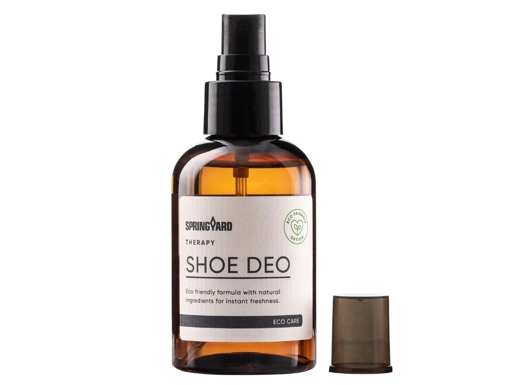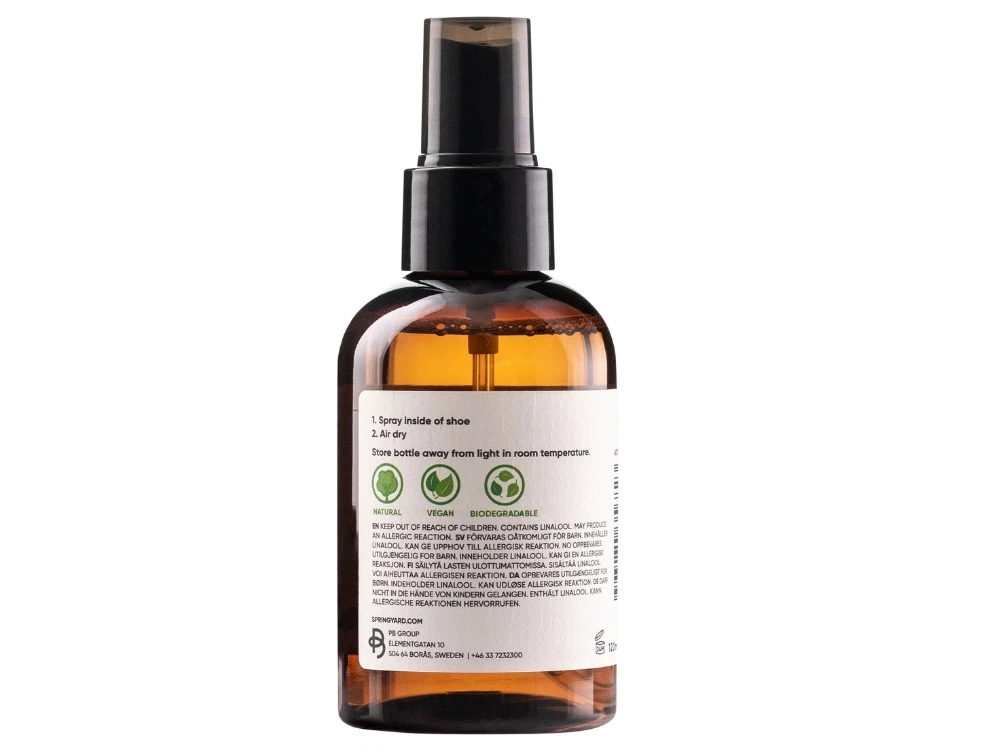 Springyard Shoe Deo skodeodorant i sprayflaskeSpringyard Shoe Deo skodeodorant med aftageligt lågSpringyard Shoe Deo skodeodorant med instruktioner og miljømærker