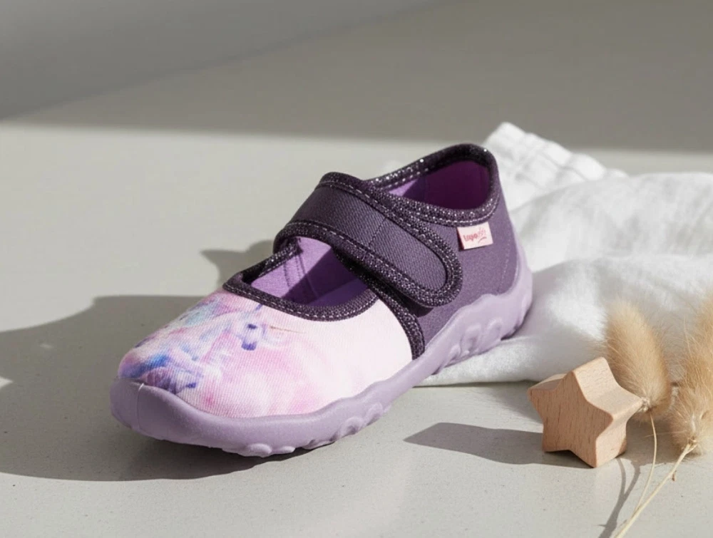 Hjemmesko i lilla tekstil fra Superfit med flot enhjørningemotiv på fronten. Modellen BONNY er designet med en fleksibel letvægtssål i blomstermønster, som giver barnet komfort og bevægelsesfrihed.
