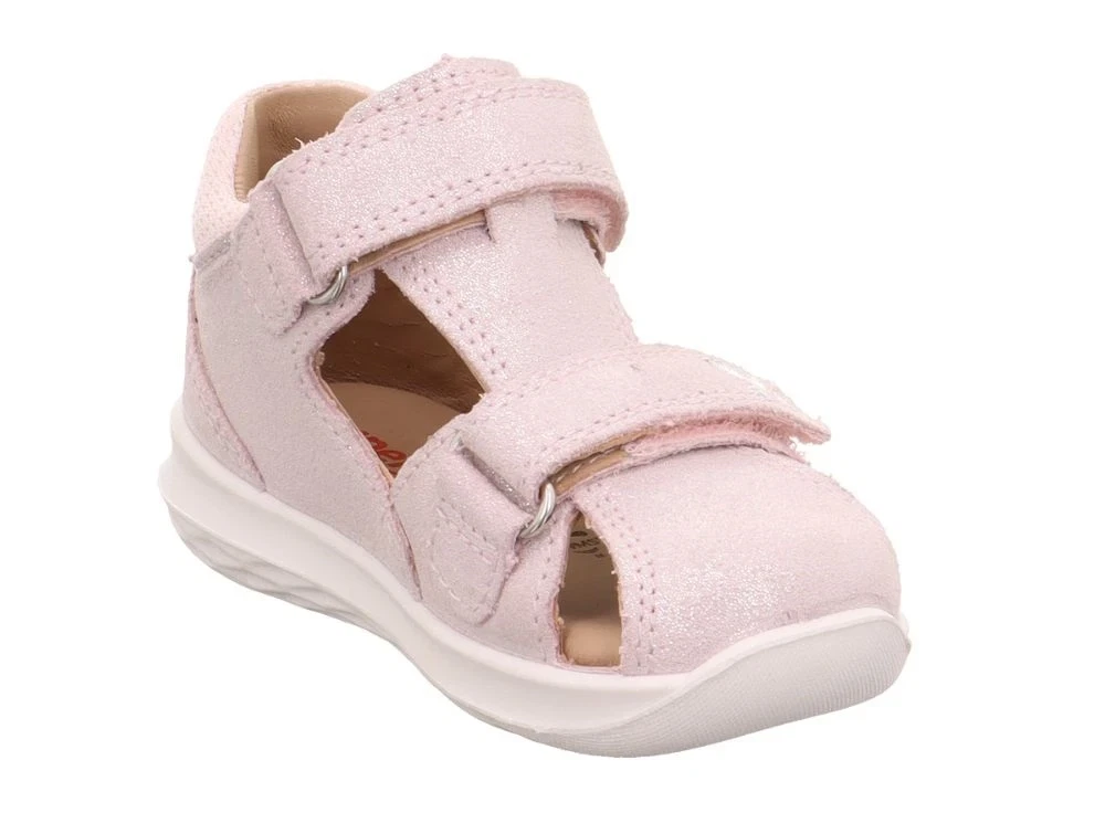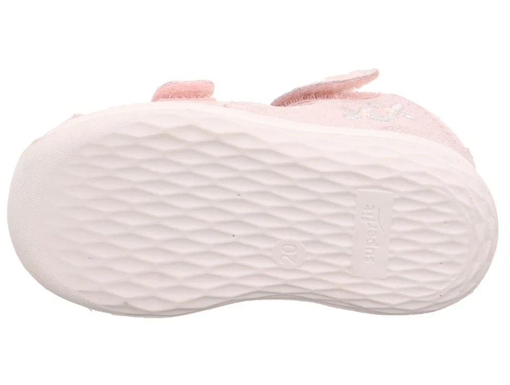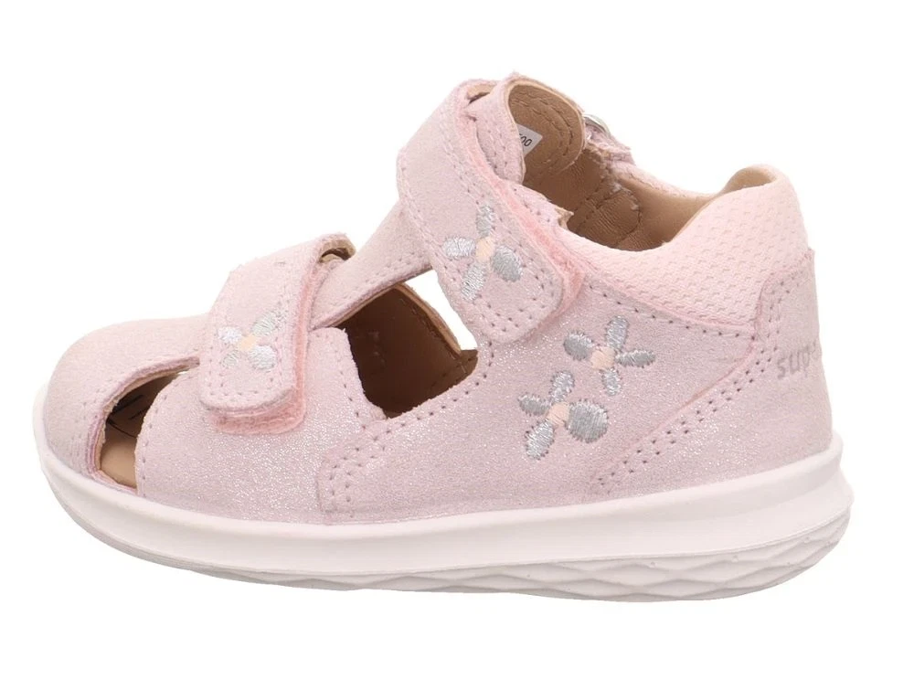 Lyserød glimmersandal i ruskind fra Superfit med fine blomsterbroderier på velcroremmene.