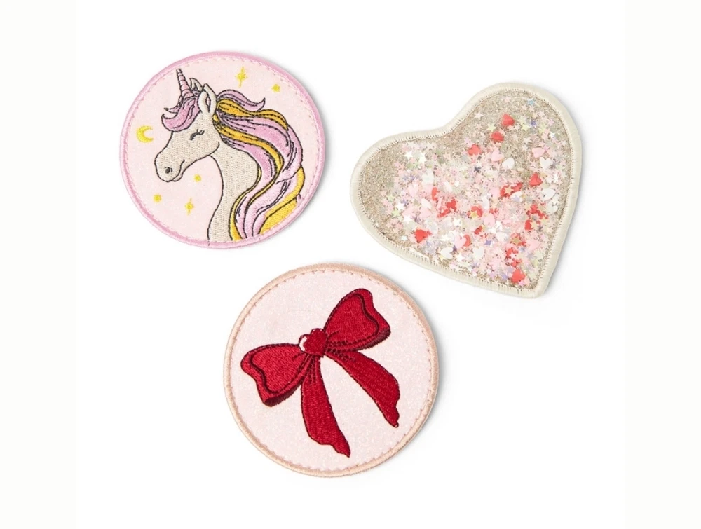 Tasken leveres med udskiftelige badges, så barnet selv kan vælge, hvilket motiv der skal stå foran – en sjov måde at gøre tasken personlig på.
