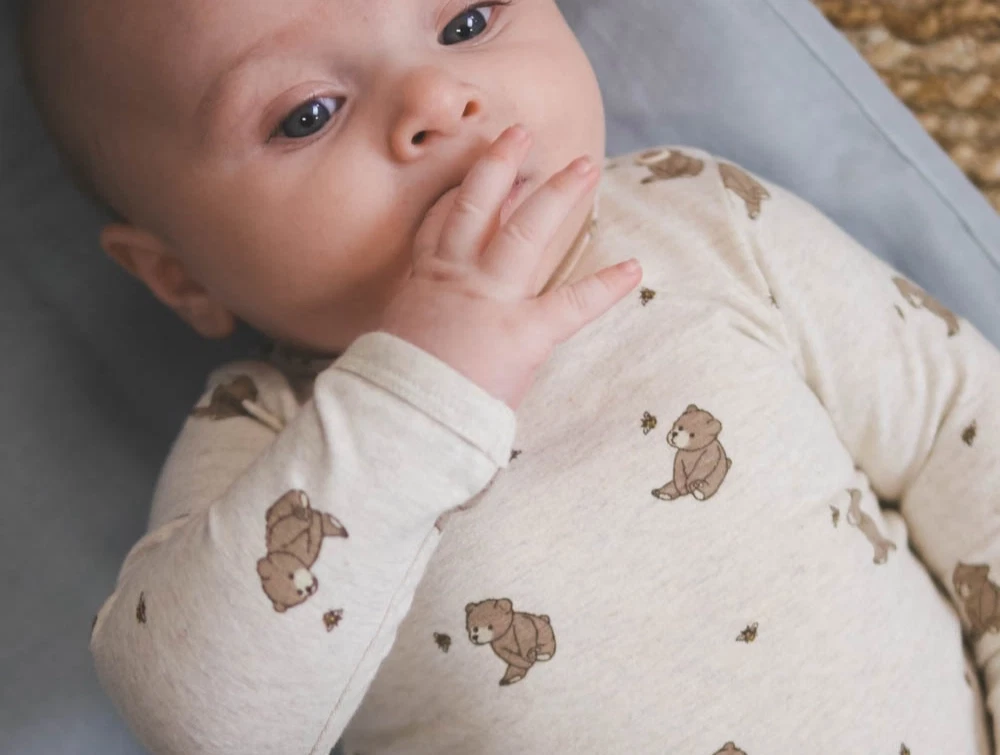 That\'s Mine bodystocking i alpaca star med print af bier og bjørneBaby iført That\'s Mine bodystocking i alpaca star med print af bier og bjørneNærbillede af That\'s Mine bodystocking med bjørneprint i alpaca star