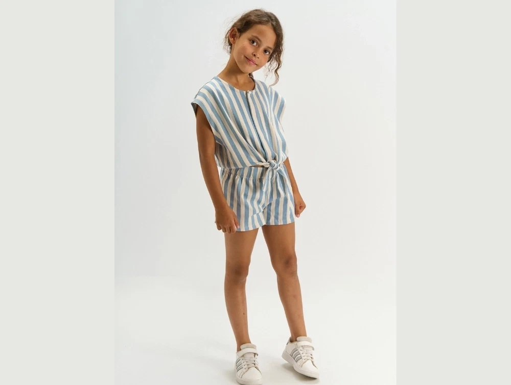 Modellen har korte ærmer og ben, frontknapper og et bindebånd ved taljen, som giver en enkel og let sommerstil.