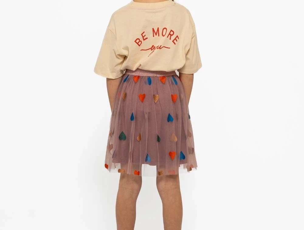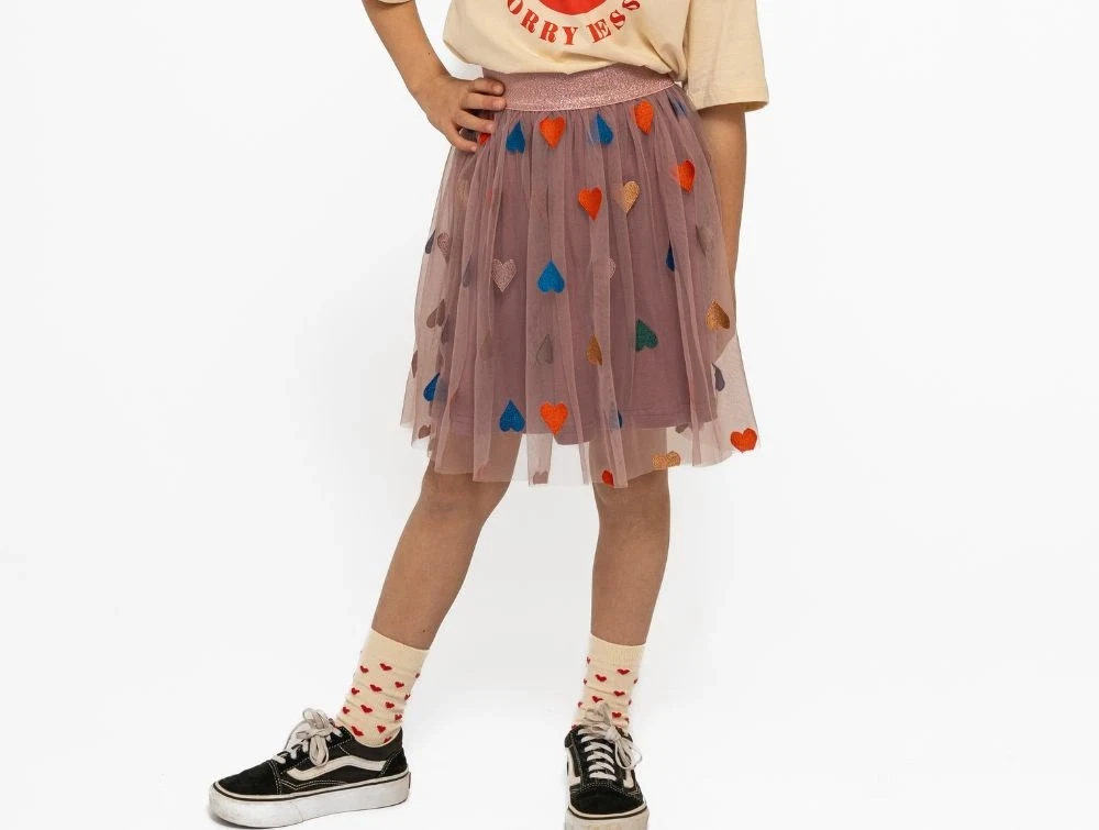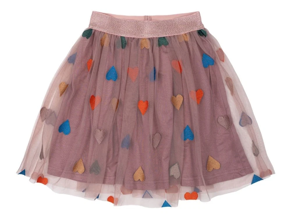 Den fine tyl nederdel har broderede hjerter, der tilføjer et sjovt og legende udtryk. Den lette og luftige kvalitet giver et flot fald, mens den glitrende elastiske talje sikrer en behagelig pasform.