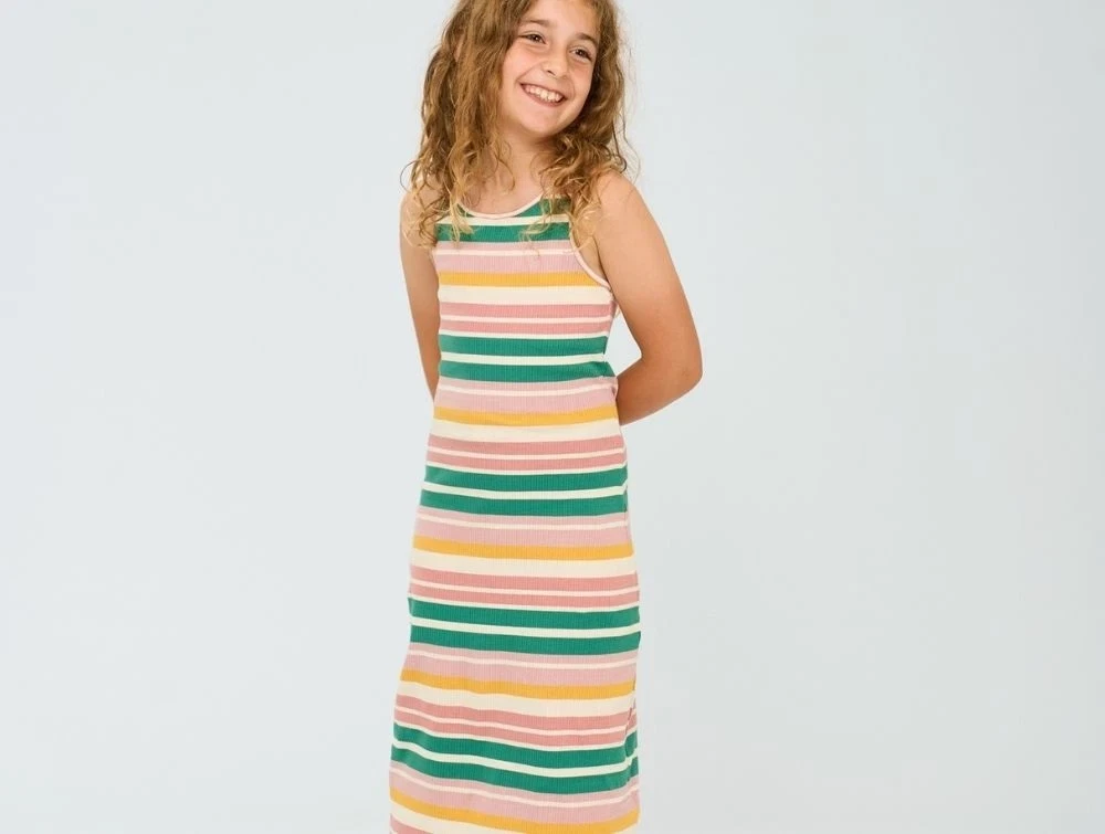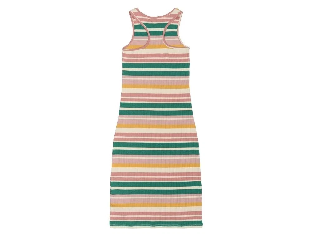 Multifarvet stribet kjole uden ærmer fra The New TN6295 multi stripedMultifarvet stribet kjole uden ærmer fra The New TN6295 multi striped bagfraPige klædt i multistribet kjole uden ærmer fra The New TN6295 multi striped